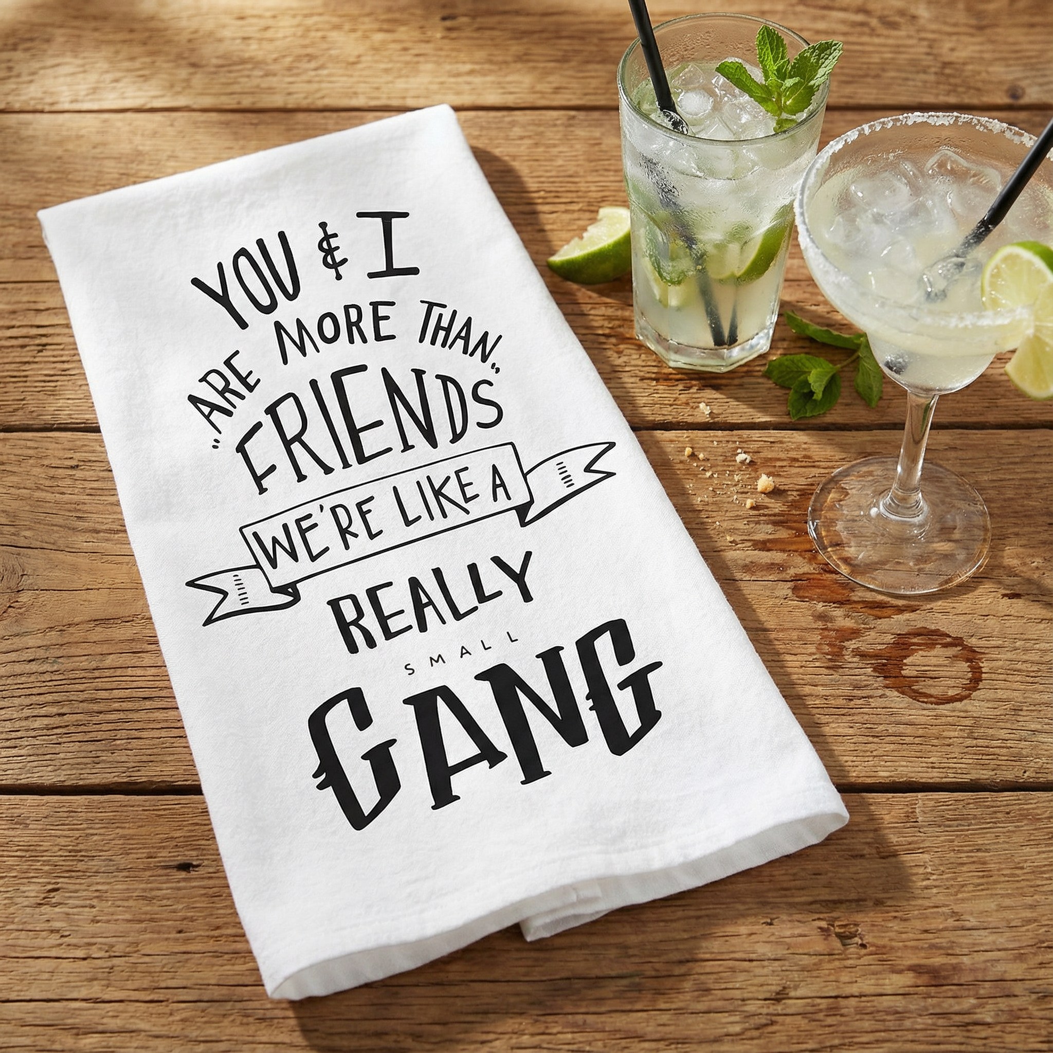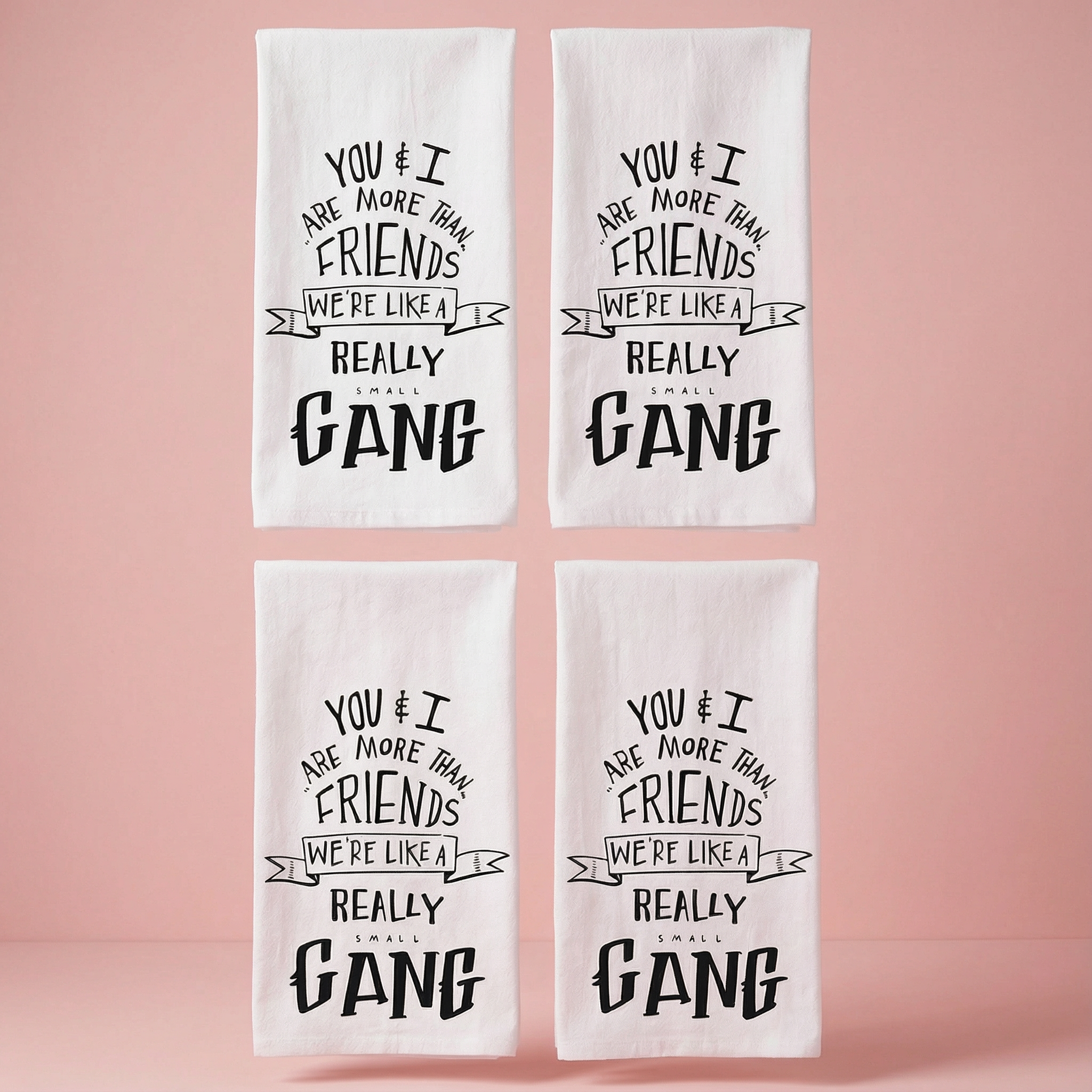 GIRL GANG! Dish / tea towel with "You & I Are More Than Friends. We're Like A Really Small Gang" boldly printed in black on a white cloth. Why give a greeting card when you could be like, look, here is a sentiment on a thing you can actually use?