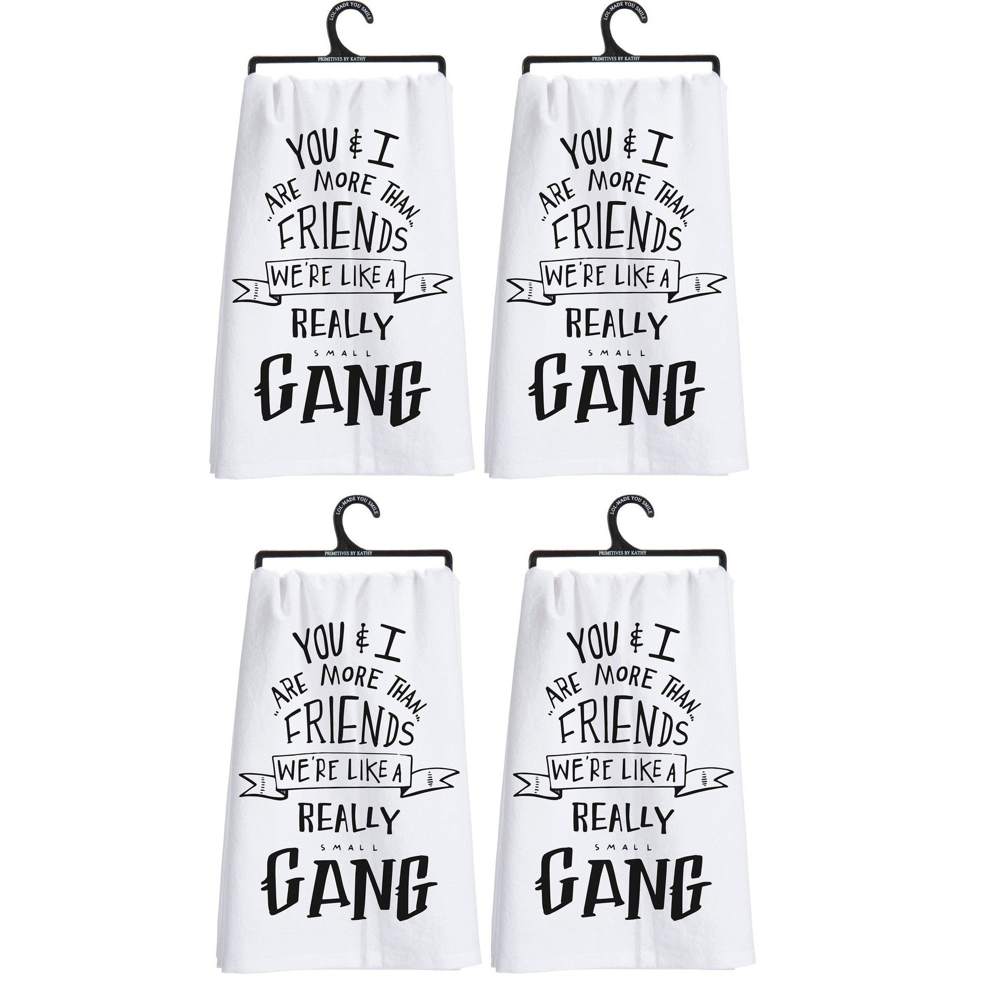 Wrap a freshly baked loaf of bread or dry your hands with this set of 4 cotton dish towels featuring the phrase "You & I Are More Than Friends, We're Like a Really Small Gang" by Primitives by Kathy. Each 28" square towel is soft, absorbent, and perfect for adding a touch of humor to your kitchen decor.