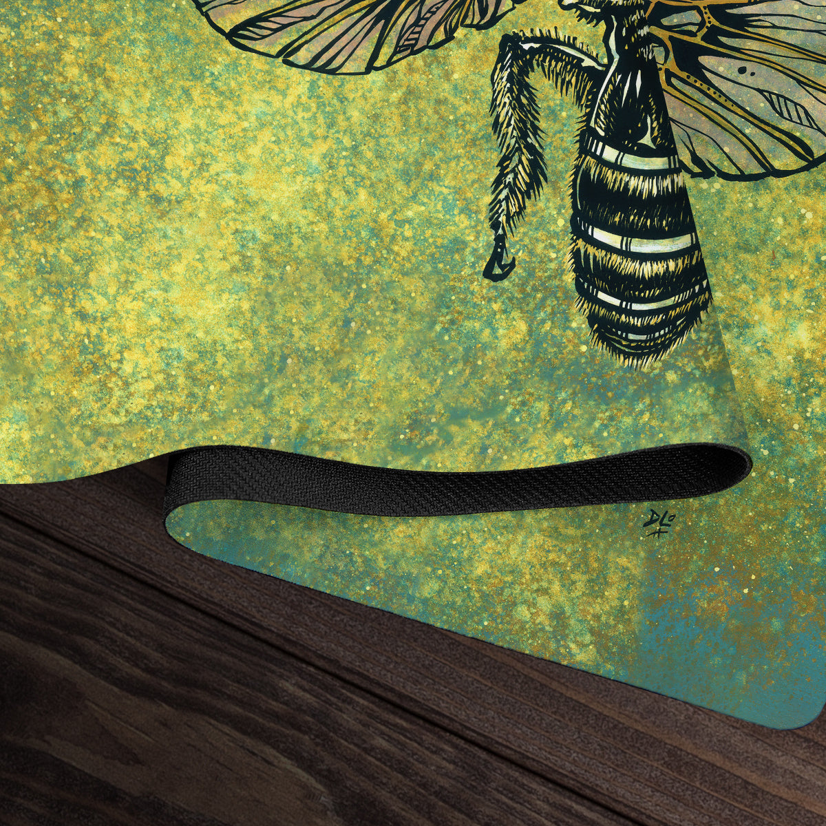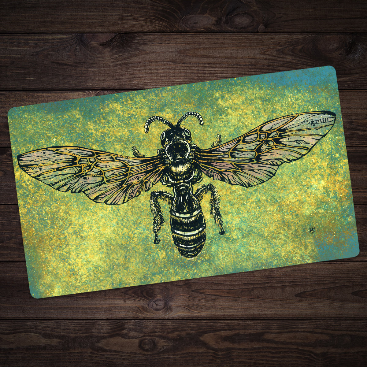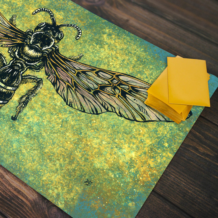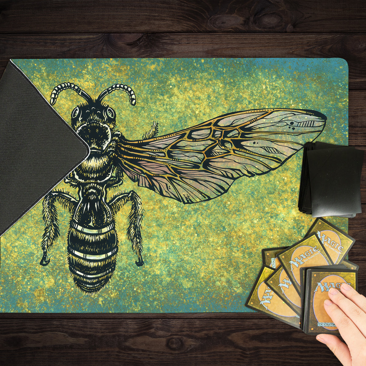 Dive into the sweet world of pollination with The Bee playmat from David Lozeau. This enchanting playmat is your ticket to a buzzing adventure where you become the honorary beekeeper of a colorful meadow. Watch as your cards flutter like petals in the wind, surrounded by the diligent bees and their vibrant, honey-gilded hive. The top is made from a sleek, soft cloth material that enhances card management, movement, and protection. The bottom also features an anti-slip rubber that keeps it still and straight on every surface! Your opponents won't just be trying to defeat you; they'll be trying to get a taste of your sweet victory!