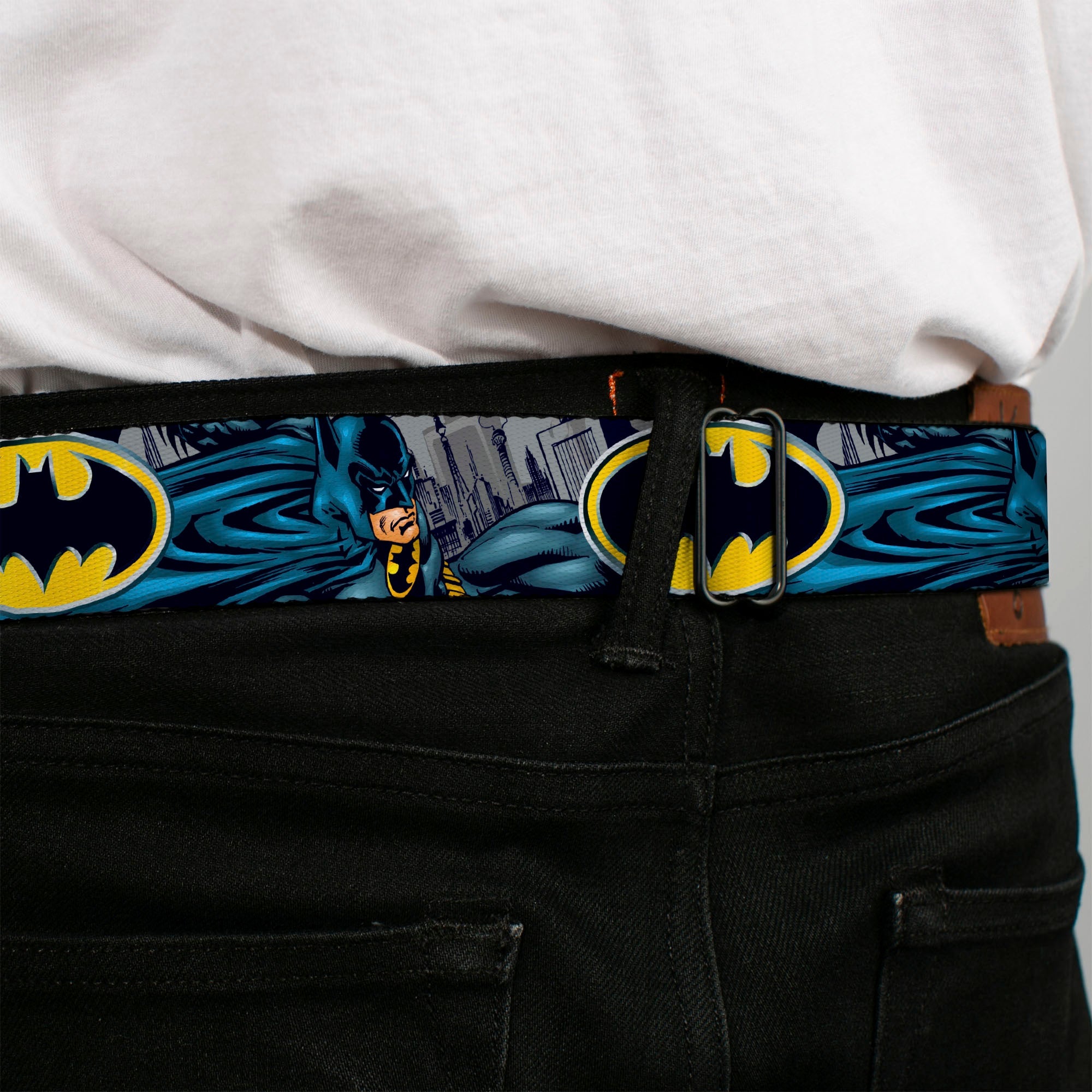 Batman Full Color Black Yellow Seatbelt Belt - Batman Bold Power Pose/Logo/Skyline Grays/Black Webbing
