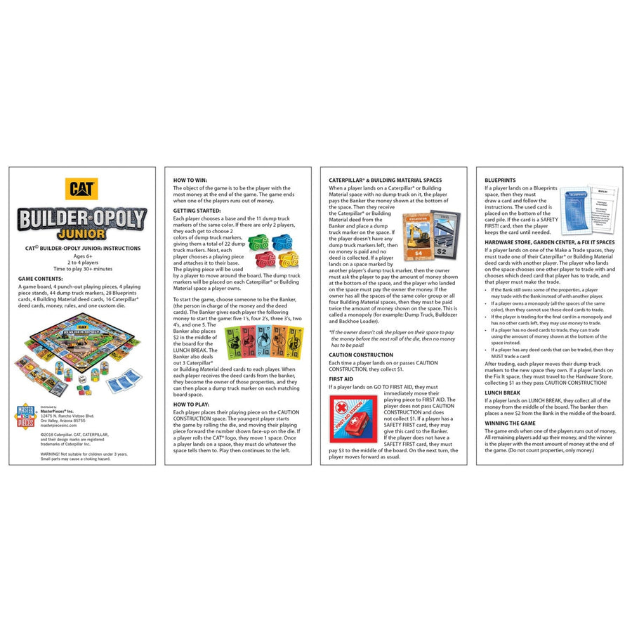 Caterpillar equipment enthusiasts of all ages will love this game! Officially Licensed CAT - Caterpillar Builder Opoly-Junior allows players to collect all the authentic CAT equipment and tools they need to get the job done. From dump trucks, to dozers, and more... all ready to get building according to your blueprints. As you collect equipment, learn awesome facts about each vehicle on the back of the card. Just make sure you don't get injured and have to go to the first aid station along the way.