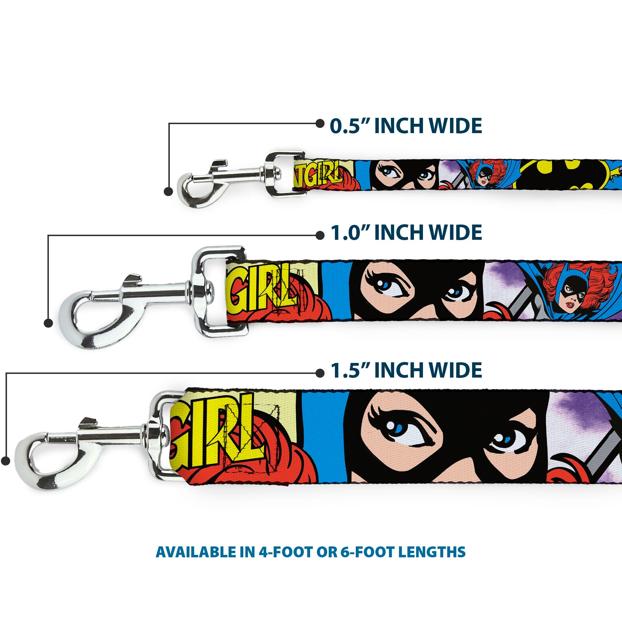 This fashion-forward dog leash is a great way to show off your favorite characters or brands. The durable components and beautiful printing ensure that the colors will continue to pop for years to come! It is made of high-density polyester and steel hardware. The leash is available in 0.5, 1.0 and 1.5 inches wide, and 4 and 6 feet in length. This product is Made in the USA by Buckle-Down Inc. and officially licensed by DC Comics.