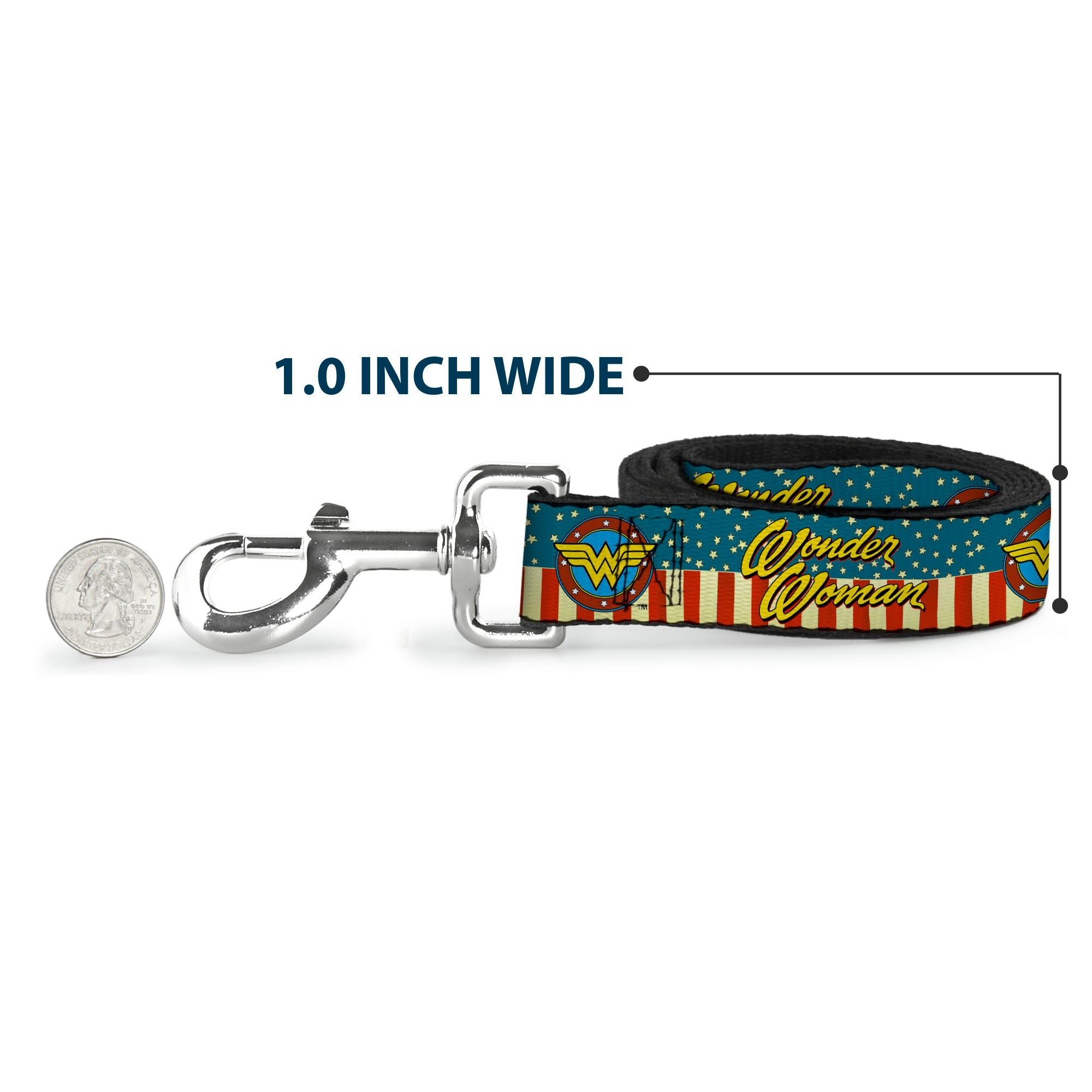 This fashion-forward dog leash is a great way to show off your favorite characters or brands. The durable components and beautiful printing ensure that the colors will continue to pop for years to come! It is made of high-density polyester and steel hardware. The leash is available in 0.5, 1.0 and 1.5 inches wide, and 4 and 6 feet in length. This product is Made in the USA by Buckle-Down Inc. and officially licensed by DC Comics.