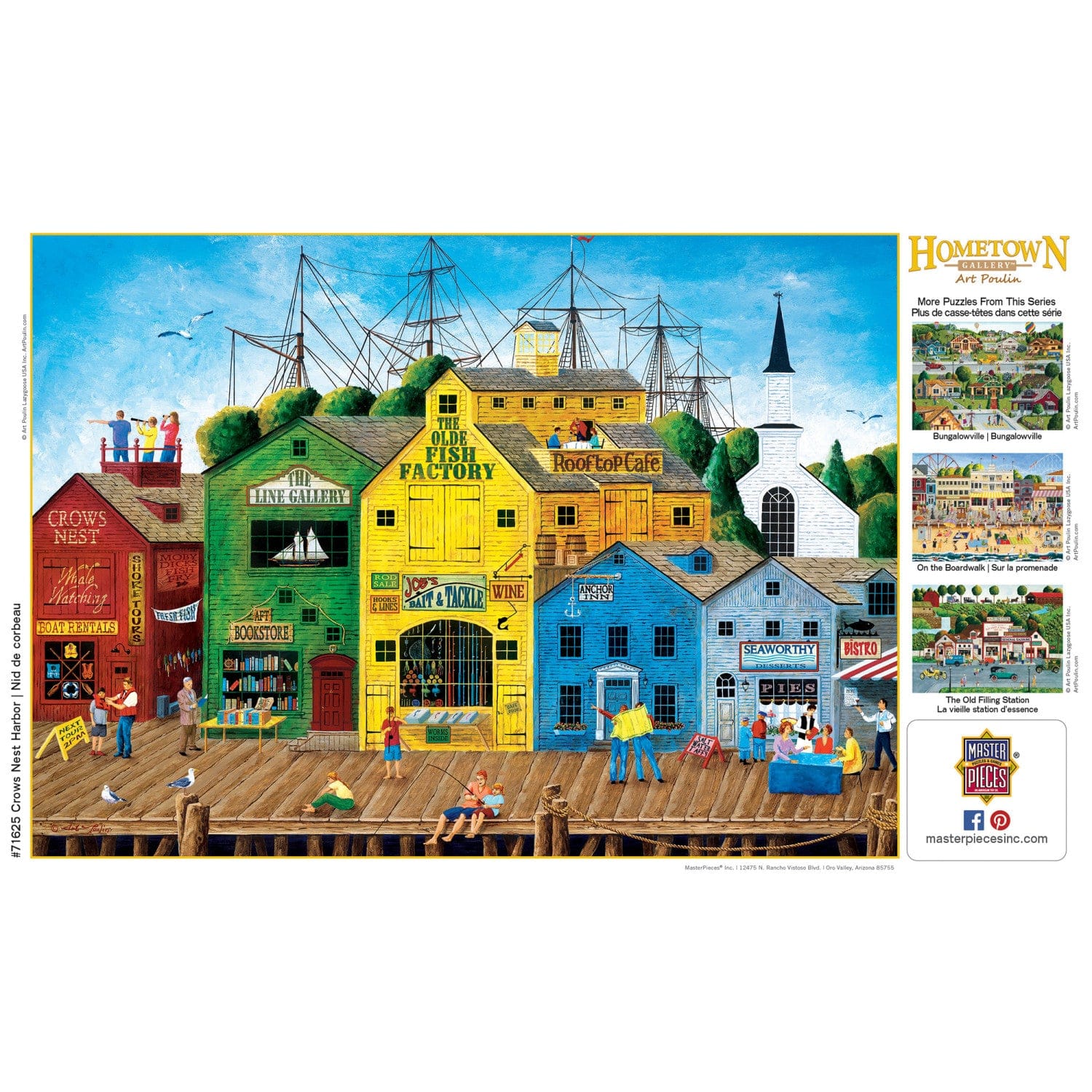 This MasterPieces 19.25" x 26.75" 1000pc Hometown Gallery Puzzle was painted by the talented folk artist, Art Poulin, and features a colorful, folksy harbor town, with families fishing on the wooden pier, shops and inns lined up behind them, and blue skies and boat tips in the background. Considered one of America's foremost folk artists, Art Poulin paints timeless canvases of inviting landscapes. On top of being an incredibly talented folk artist, Art also served in the US Army for 27 years, and is a classical pianist. With its timeless beauty, this puzzle is sure to offer you an afternoon of puzzling fun! To reduce its impact on our environment, the chipboard used in this puzzle is made of 100% recycled material.
