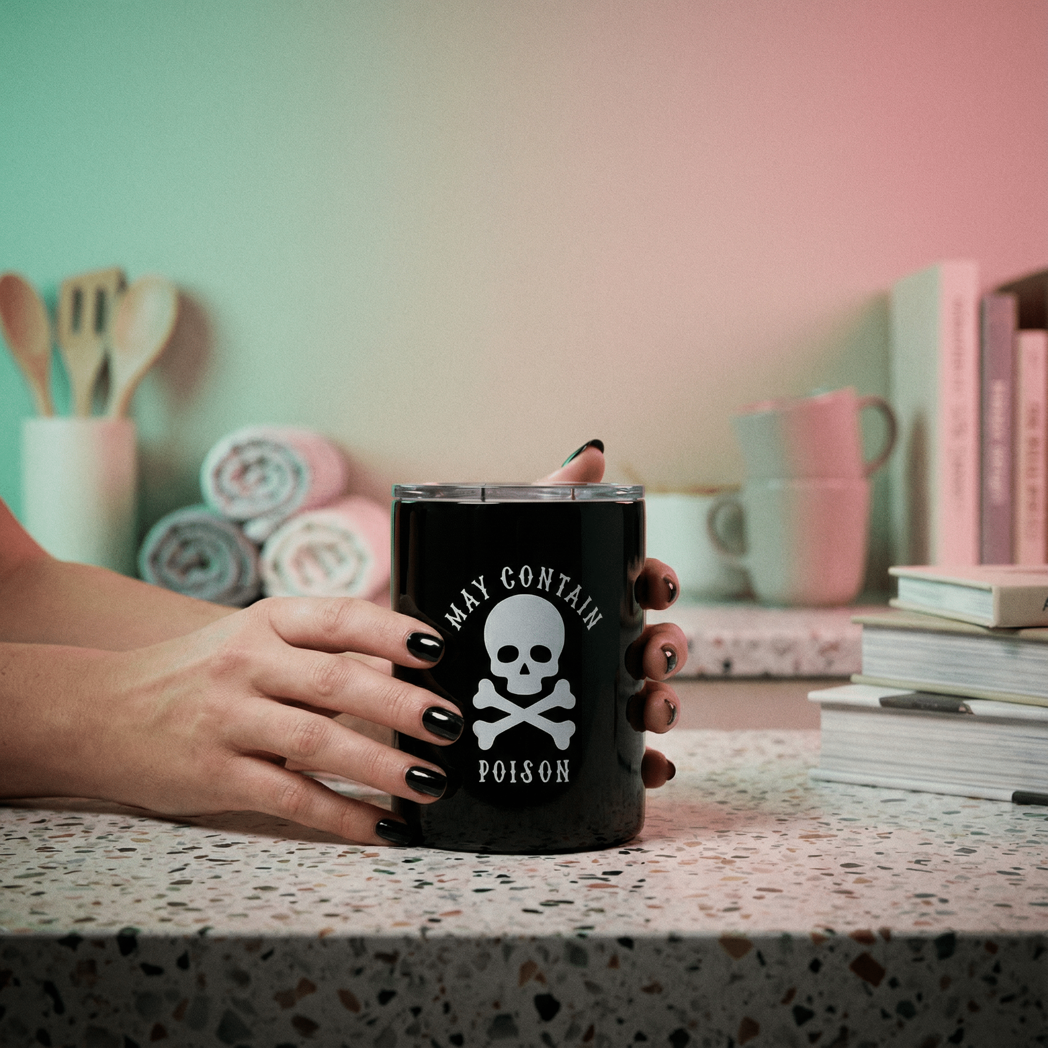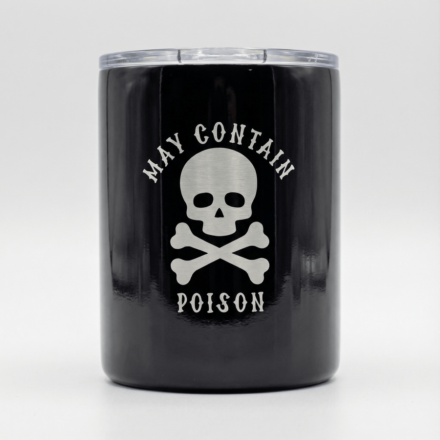 Give the gift of style with the May Contain Poison Stainless Steel Tumbler featuring a skull design, perfect for keeping drinks hot or cold on the go. At 3.5" x 4.5" h and 12 oz, this sleek stainless steel tumbler by Slant Collections is hand wash only, making it ideal for those who appreciate unique and practical gifts.