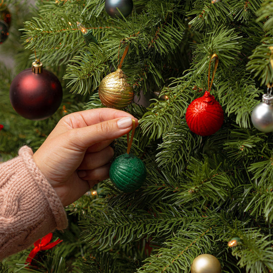 Each ornament hides a decadent surprise inside — rich milk chocolate, handcrafted for a melt-in-your-mouth experience that evokes the warmth and wonder of the season. Adorned with elegant ribbons, these chocolates can be hung on your Christmas tree as edible ornaments, used as stocking stuffers, or displayed as part of your holiday centerpiece.
