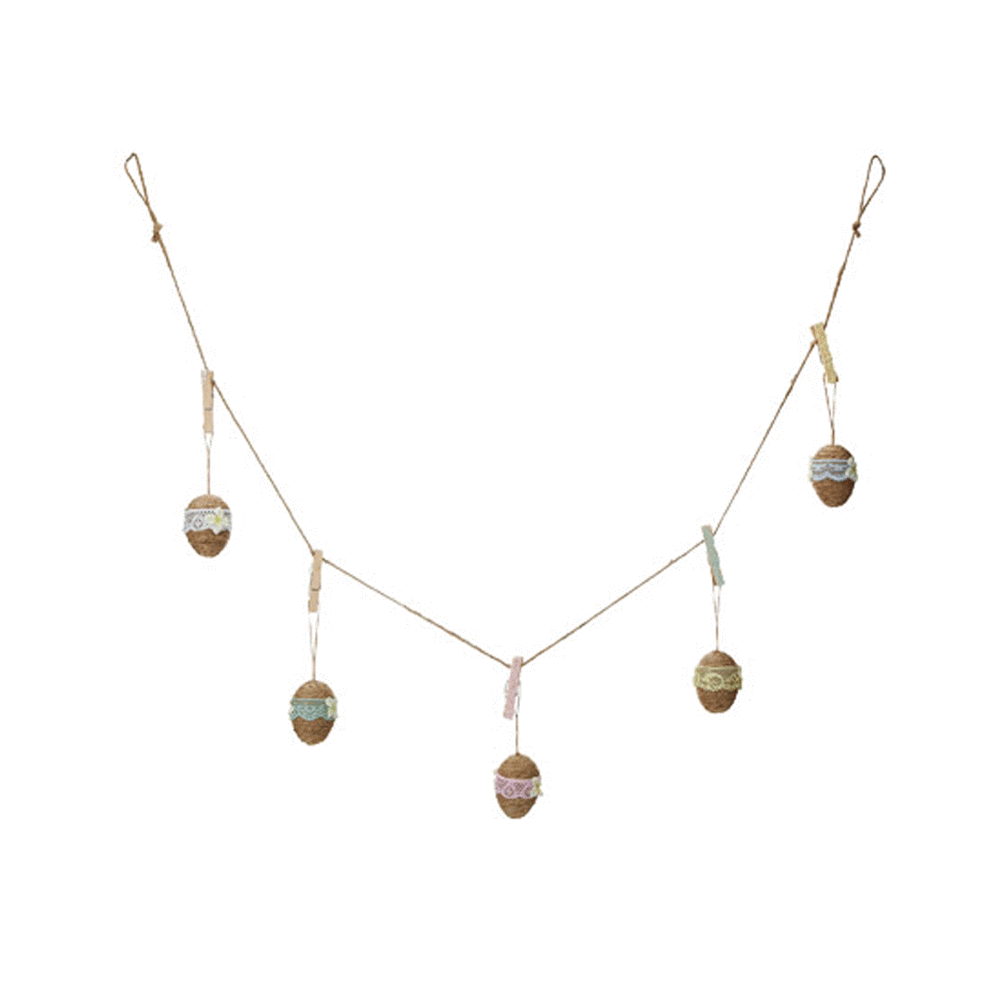 Add a country touch to your decorations with this unique burlap Easter egg garland. Five burlap-wrapped eggs decorated in multicolored lace and flowers stretch across 59 inches to highlight the holiday.