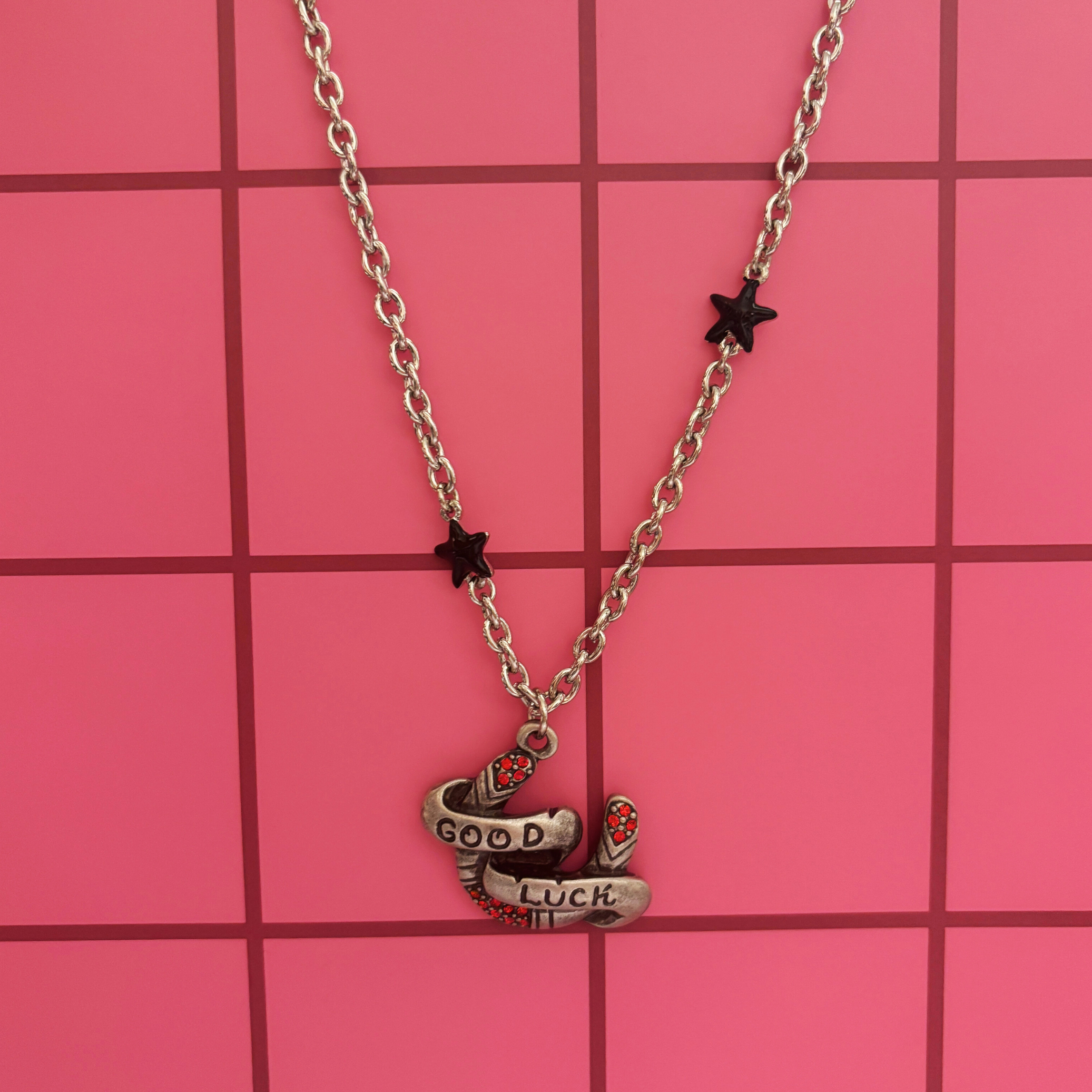Carry a little luck with you wherever you go with the Sourpuss “Good Luck” Horseshoe Necklace. This tri-charm piece features a tarnished horseshoe charm with a bold Good Luck banner, sparkling red rhinestones, and two striking black star charms. Measuring 1.5" x 1", the horseshoe is just the right size to stand out without overwhelming your look. The necklace hangs from a 16" chain with a 2" extender, making it easy to adjust for the perfect fit.