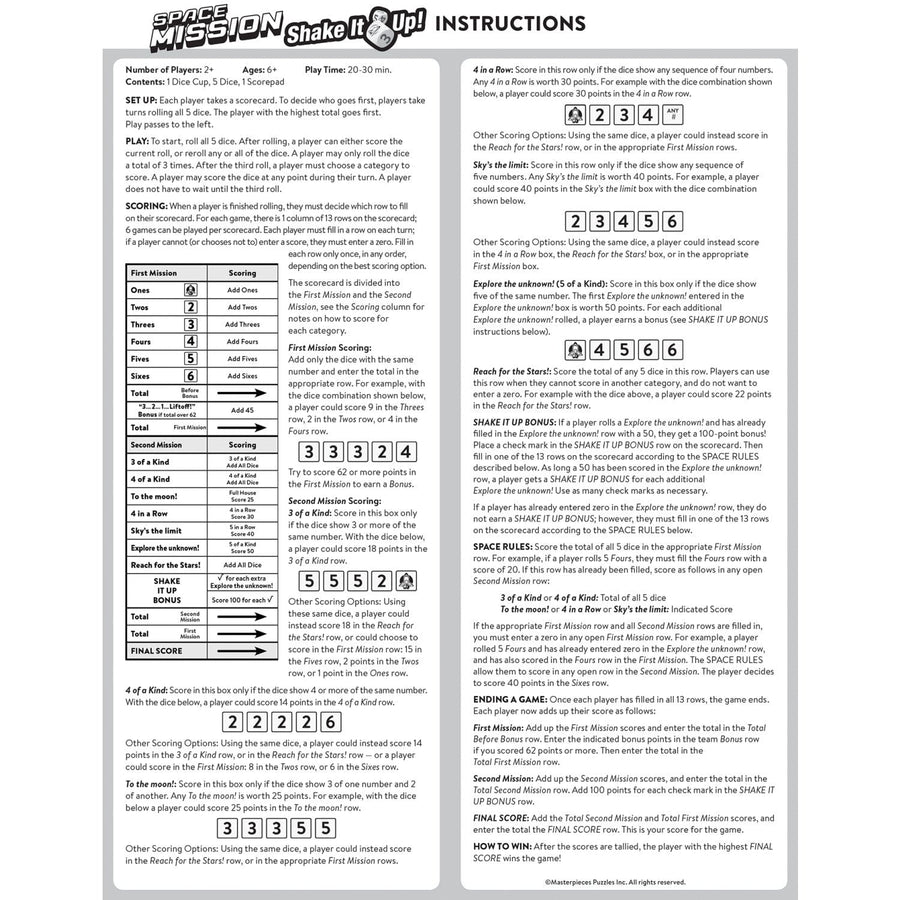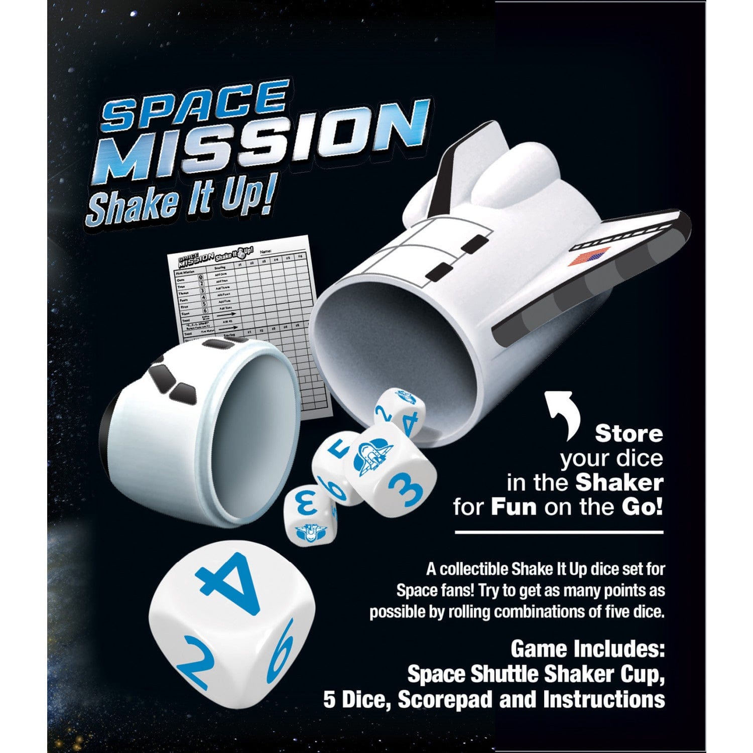 This MasterPieces Space Mission Shake it Up! Dice Game is a collectible travel dice game for Space fans! This space-rolling dice game is perfect for game night with the family. Try to get as many points as possible by rolling different combinations of all five dice. The Shake it Up! Dice Game includes a Space Shuttle dice cup, 5 dice, and a Space-themed scorepad! Two or more Space fans, ages 6+, can play this travel dice game!