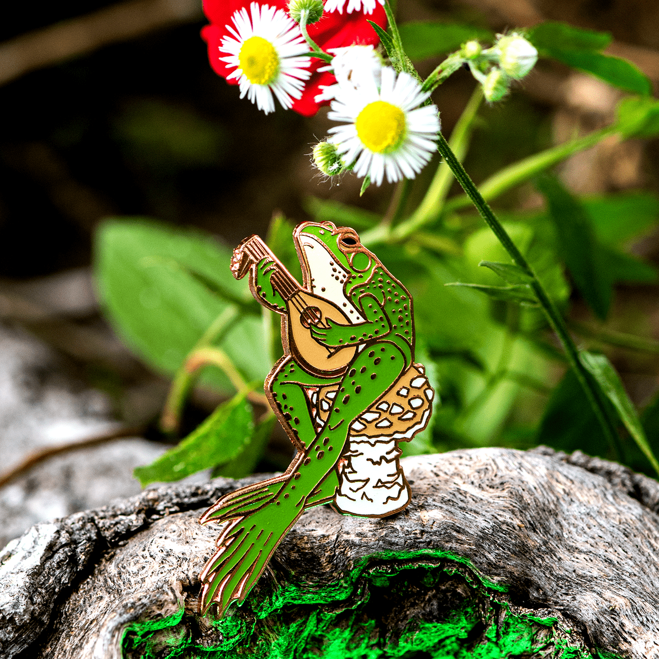 With his golden agaric mushroom seat and playful little smile, he'll steal the show on your pin board, and captivate your friends when he rides along on your jacket or backpack.