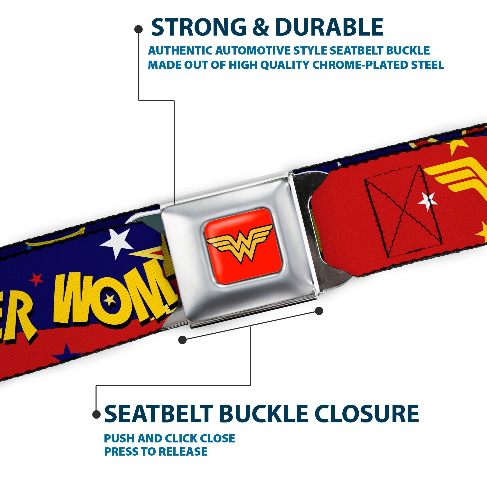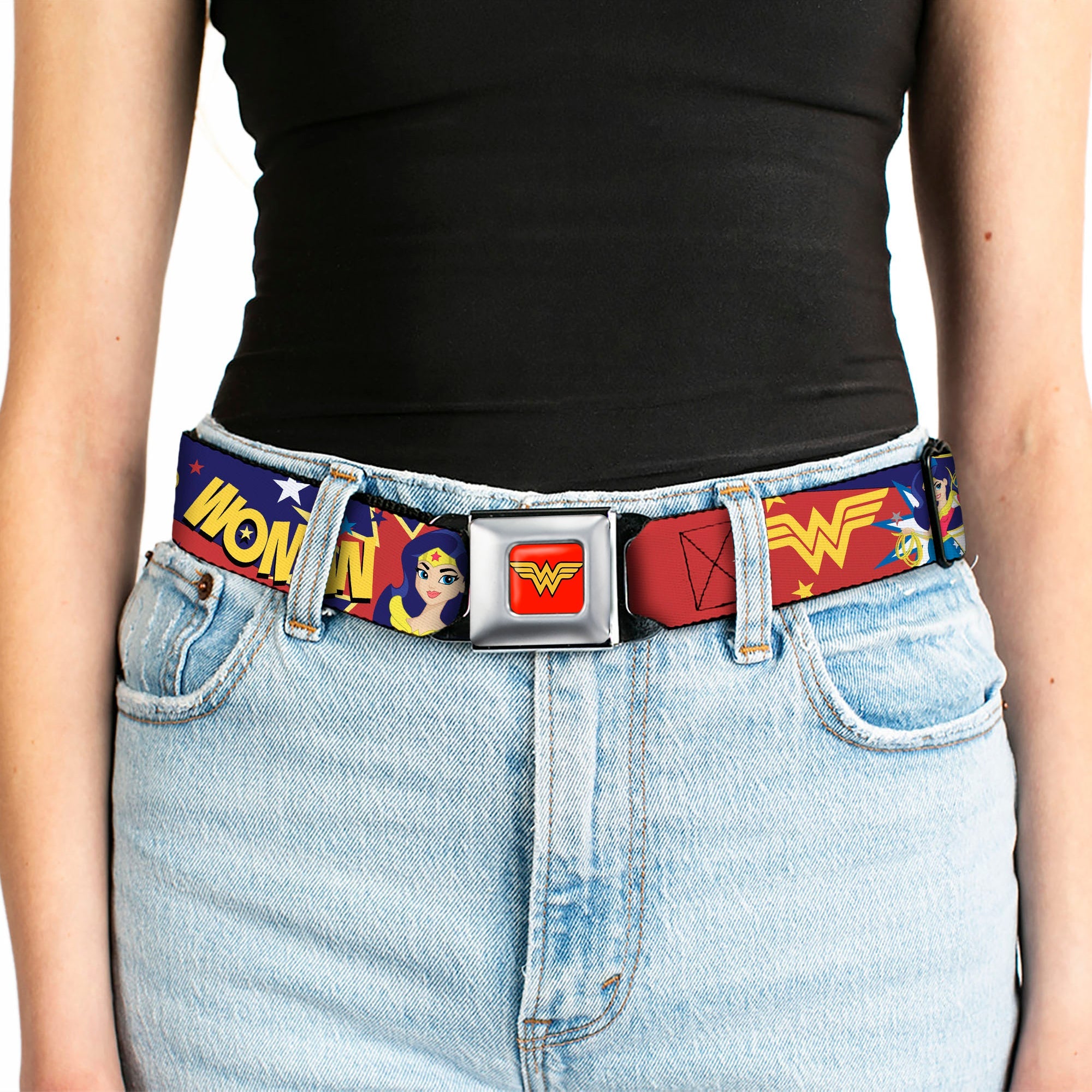 Buckle-Down's iconic Seatbelt Belt is a cool, smart, and exciting blend of fashion and function. Always a conversation starter, our Seatbelt Belt adjusts to perfectly fit your waist while showcasing your unique sense of style. Our Seatbelt Belts are made with authentic automotive style seatbelt buckles making them easy to open and close at the push of a button. Our adult-size Seatbelt Belts are 1.5 inches wide and our kid-sized Seatbelt belts are 1.0 inch wide. This product is Handcrafted in USA by Buckle-Down Inc. and officially licensed by DC Comics.