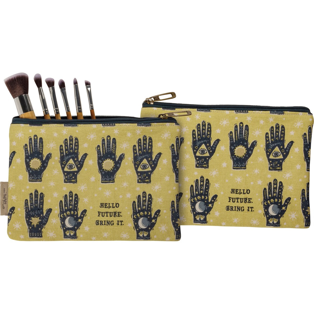 A double-sided cotton linen blend zipper pouch featuring mystical block print designs and "Hello Future. Bring It." sentiment. Pouch is fully lined and includes top zipper closure.