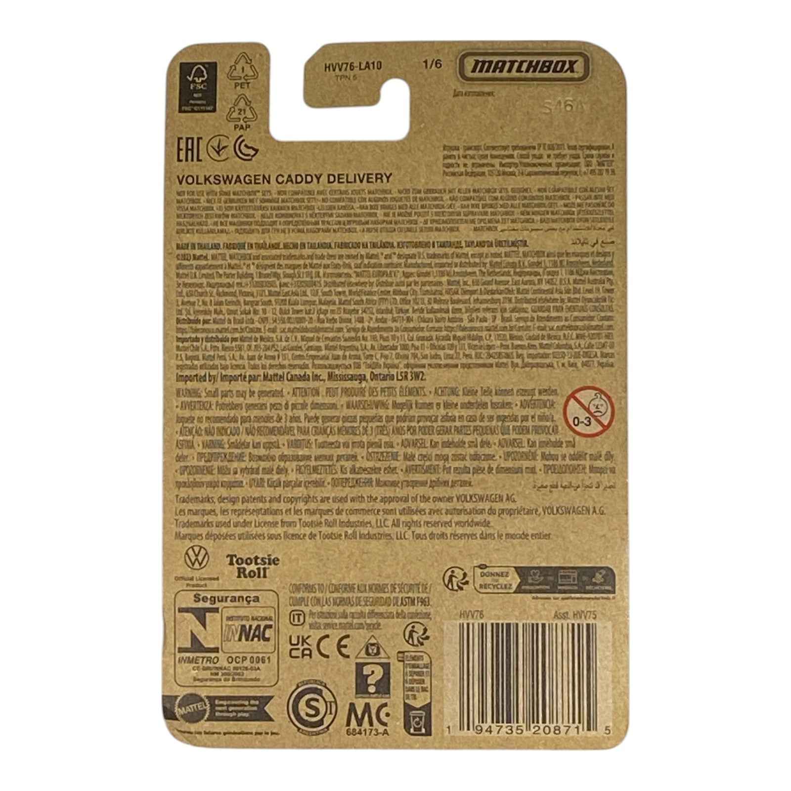 Crave a burst of nostalgia in your die-cast lineup with the white Matchbox Volkswagen Caddy Delivery Tootsie Roll Pop Candy Series 1/6, a delectable 1:64-scale van that packages 1970s VW charm with iconic candy branding. This pristine white delivery vehicle features vibrant Tootsie Roll Pop graphics, candy-striped accents, and a glossy finish that captures the essence of retro sweets delivery, complete with rolling wheels for instant play or pristine display. As the kickoff gem in the Matchbox Candy Series, it's a limited-edition treat for VW enthusiasts, candy-themed collectors, and die-cast aficionados searching "Matchbox Tootsie Roll Pop Caddy white" – blending compact van heritage with sugary appeal in every detailed panel. Hunt down this 1/6 series starter to sweeten your collection with timeless Mattel quality and irresistible allure.