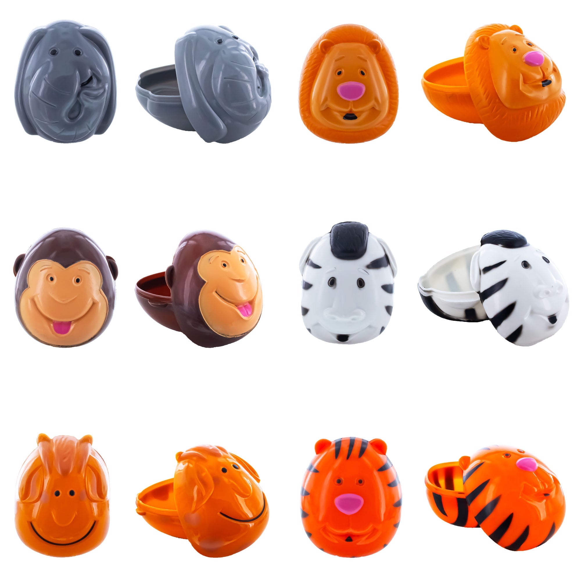 Our Set of 12 Fillable Animal Plastic Eggs includes 12 assorted wild animals ready to fill, including: Tiger, Zebra, Monkey, Lion, and Elephant.
