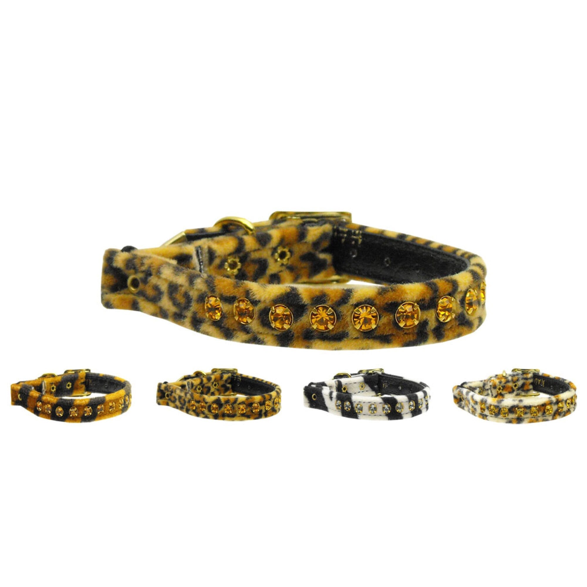 Fun and furry animal print cat collar with elastic safety band. This adorable faux leather and velvet collar is adorned with glistening rhinestones. This collar is available in two sizes and an array of animal print patterns.
