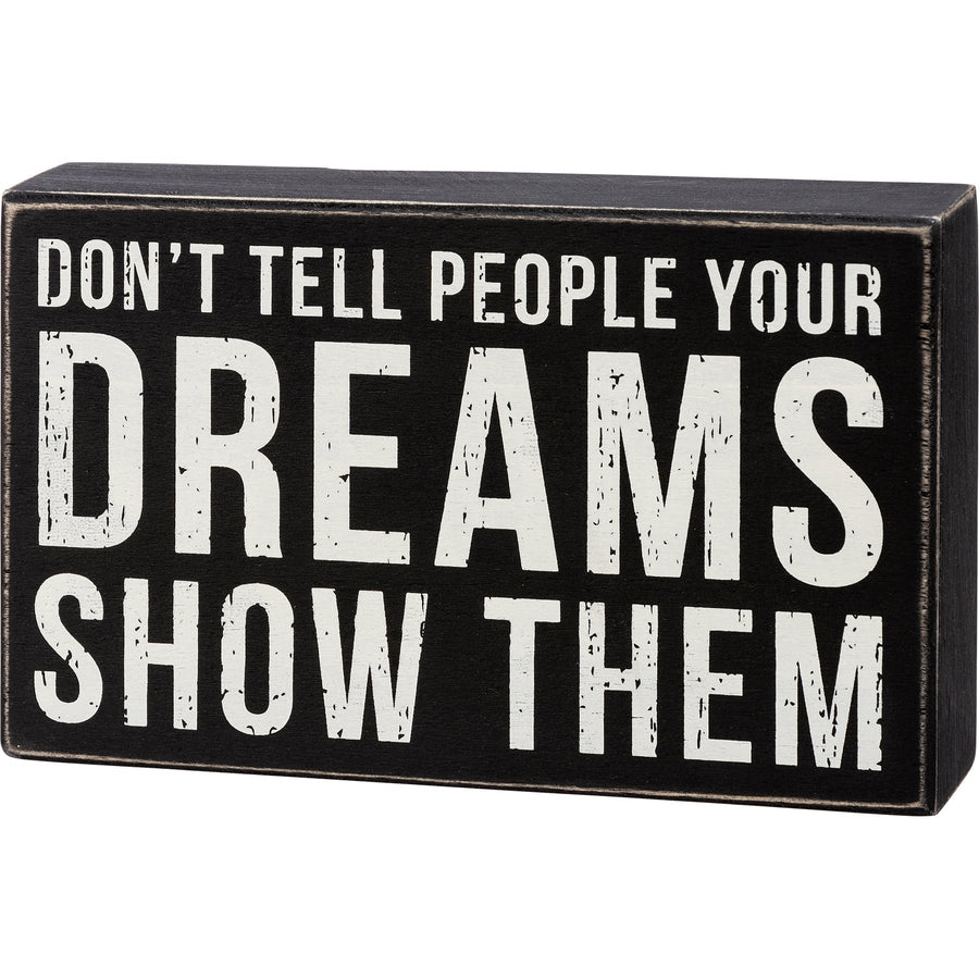 A classic black and white box sign featuring a distressed "Don't Tell People Your Dreams Show Them" sentiment.