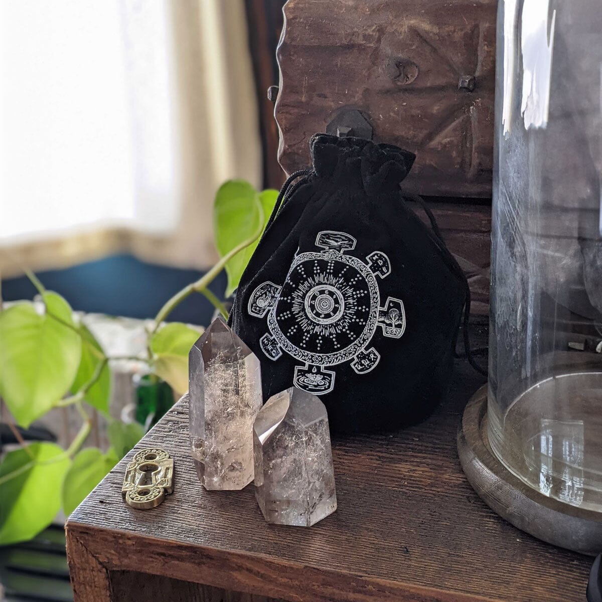 A black faux suede satchel custom fitted for a set of Geomantic Visions coins. The satchel emblem is screen printed in white ink.