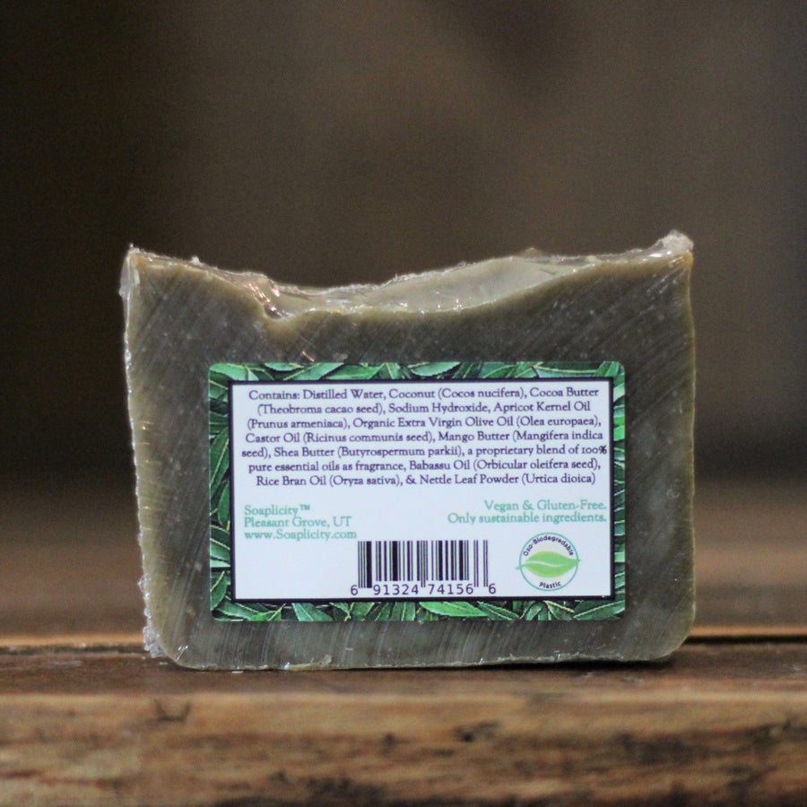 It has a moisture-rich lather from Extra Virgin Olive Oil, Cocoa, Shea, and Mango Butters and then we added enriching rice bran and Apricot Kernel oils. Nettle Leaf powder gives it its color and skin-soothing qualities, and Bentonite Clay adds cooling sensations. Bottom line, this is a bar loved by so many for a reason!
