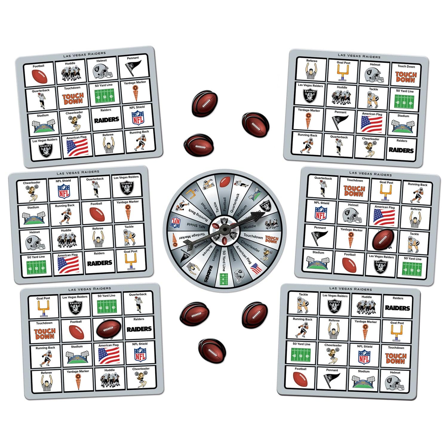 Play bingo with your favorite NFL Team! This Las Vegas Raiders Bingo Game puts a football spin on the family favorite. Many of the symbols represent your favorite NFL Team and other football memorabilia. Make all 9 matches and be the first to shout BINGO! This MasterPieces Bingo Game includes 1 spinner, 6 gameboards, and 84 custom tokens. Perfect for ages 3 and up.