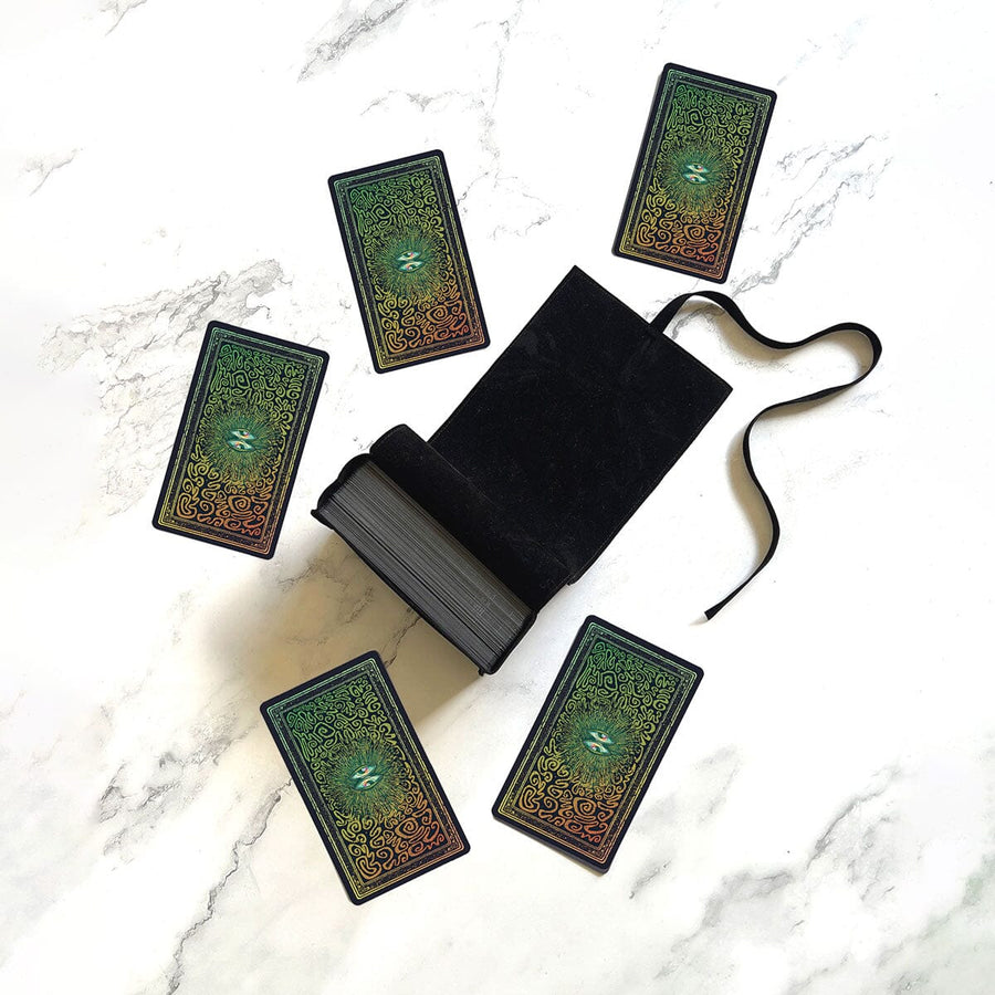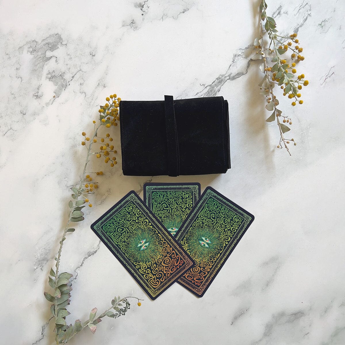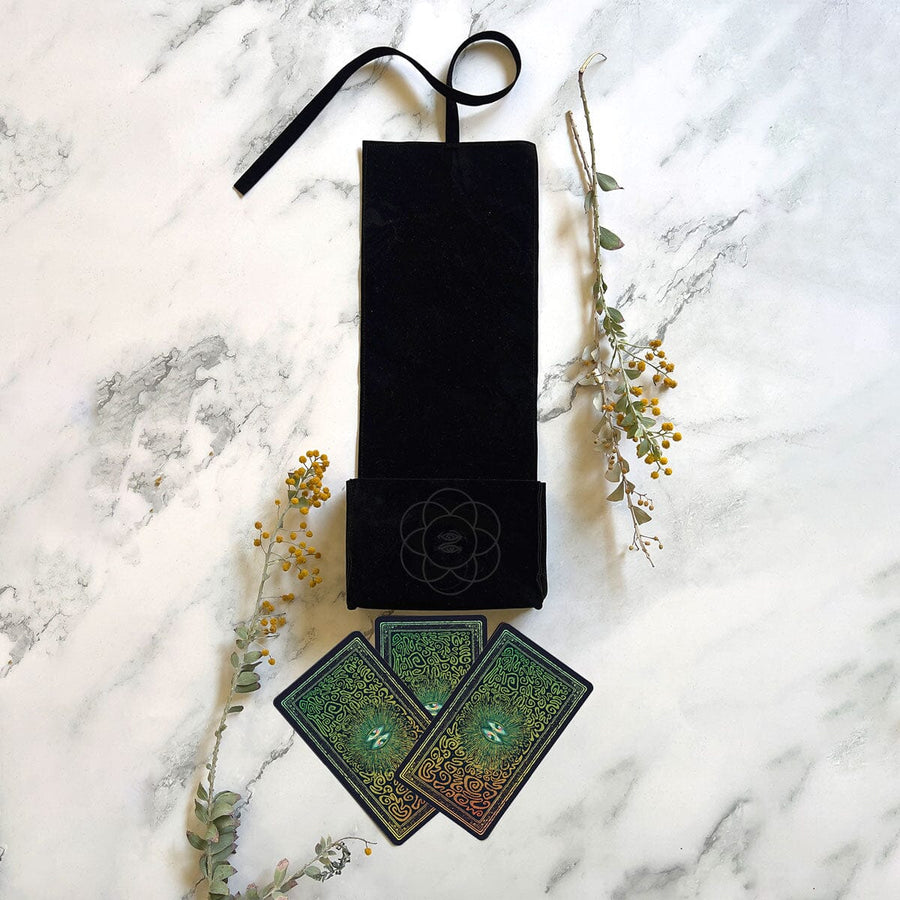 A black faux suede satchel custom fitted for a deck of Mirra Visions cards or other standard Tarot-sized deck (2.75 x 4.75 inches). The satchel has an extended flap that unfolds to approx. 9" to do a three-card reading on the go. The Mirra Visions emblem is embossed on the inside of the satchel.