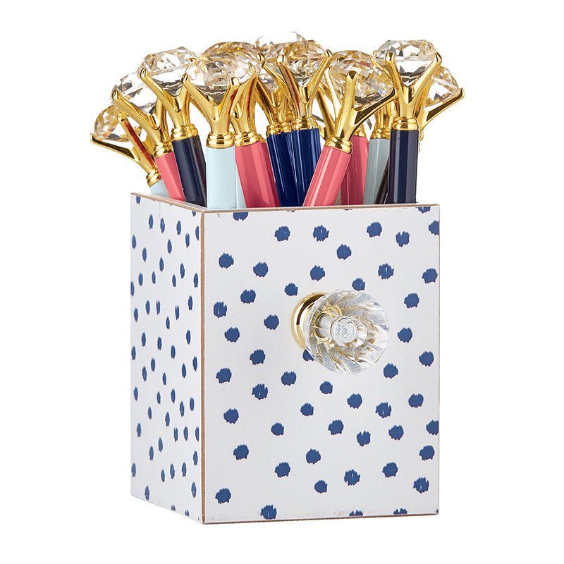Add a touch of elegance to your workspace with the Navy Blue Gem Pen from Santa Barbara Design Studio. This sleek ballpoint twist pen measures 5.5" long and is made of durable metal, making it a stylish and practical addition to your office supplies collection. Looking for a unique and practical gift for a coworker or friend? This Giftable Single Pen is sure to impress with its glamorous navy blue design and high-quality construction. Makes a thoughtful gift for any occasion!