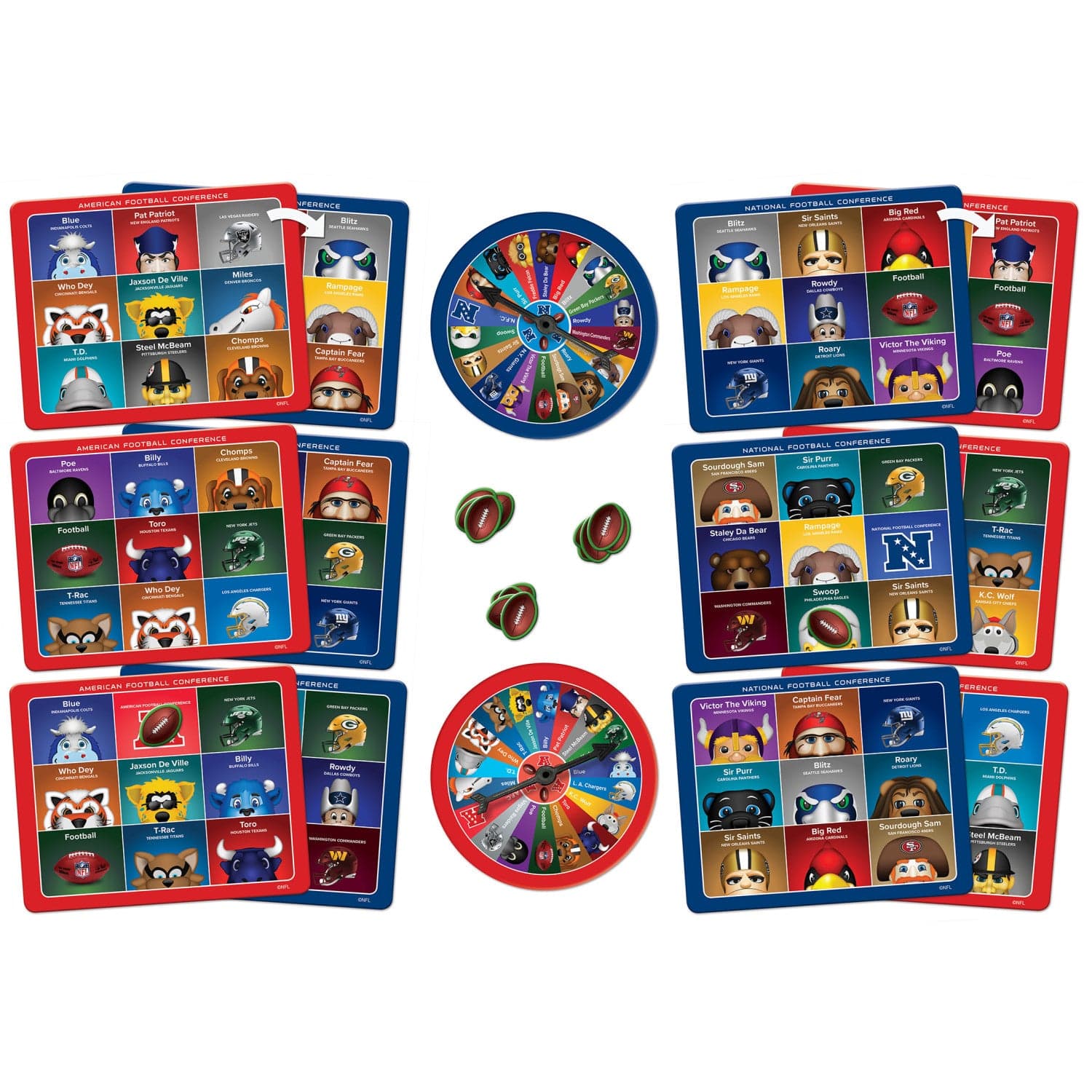 Play bingo with the famous Mascots of NFL! This game features the famous NFL Mascots featuring S. Preston Minimalist Mascot art. Make all 9 matches and be the first to shout BINGO! This MasterPieces bingo game includes 2 spinners, 6 double-sided game boards, and 84 tokens. Choose the 6 boards and spinner for your favorite Conference!