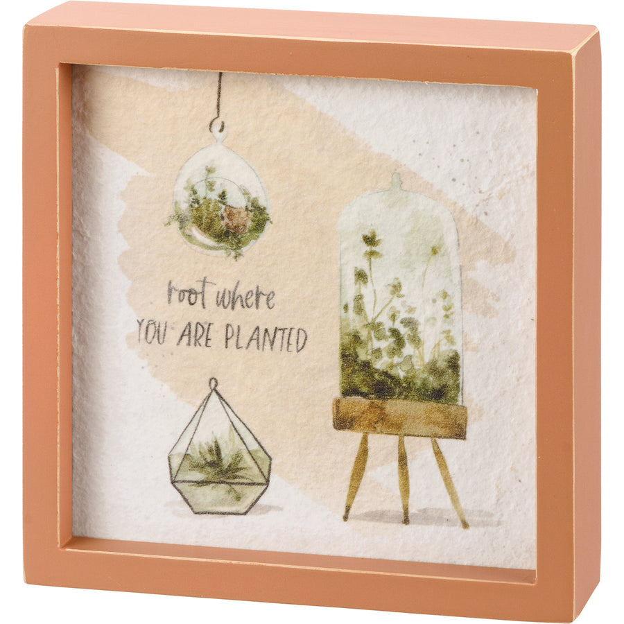 An inset wooden box sign featuring the sentiment "Root Where You Are Planted" in an indoor plant design on watercolor paper.