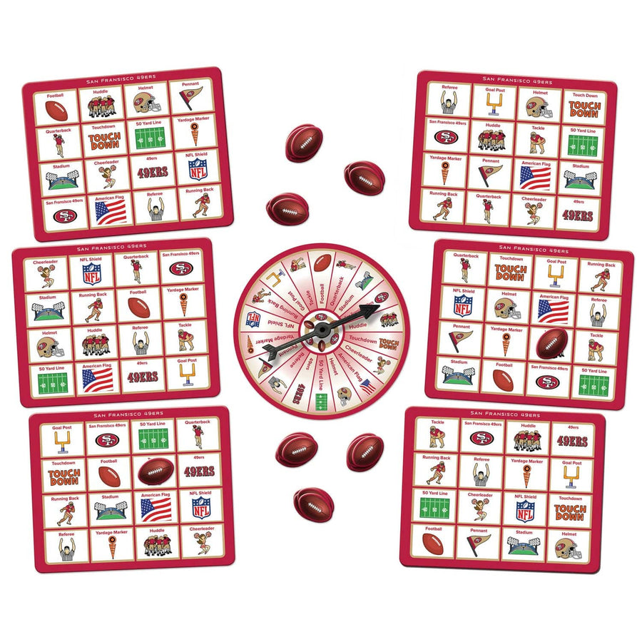 Play bingo with your favorite NFL Team! This San Francisco 49ers Bingo Game puts a football spin on the family favorite. Many of the symbols represent your favorite NFL Team and other football memorabilia. Make all 9 matches and be the first to shout BINGO! This MasterPieces Bingo Game includes 1 spinner, 6 gameboards, and 84 custom tokens. Perfect for ages 3 and up.