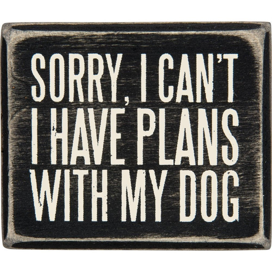 A classic black and white wooden box sign featuring a distressed "Sorry, I Can't - I Have Plans With My Dog" sentiment. Easy to hang or can free-stand alone.