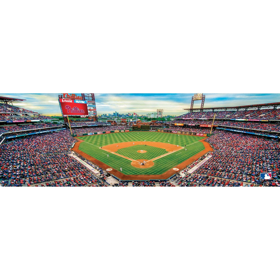 This MasterPieces MLB 1000pc 13" x 39" Panoramic Philadelphia Phillies Puzzle features the view from behind home plate of the Philadelphia Phillies' Citizens Bank Park with such incredible detail that it's common for you to find yourself as part of the photograph! To reduce its impact on our environment, the chipboard used in this puzzle is made of 100% recycled material.