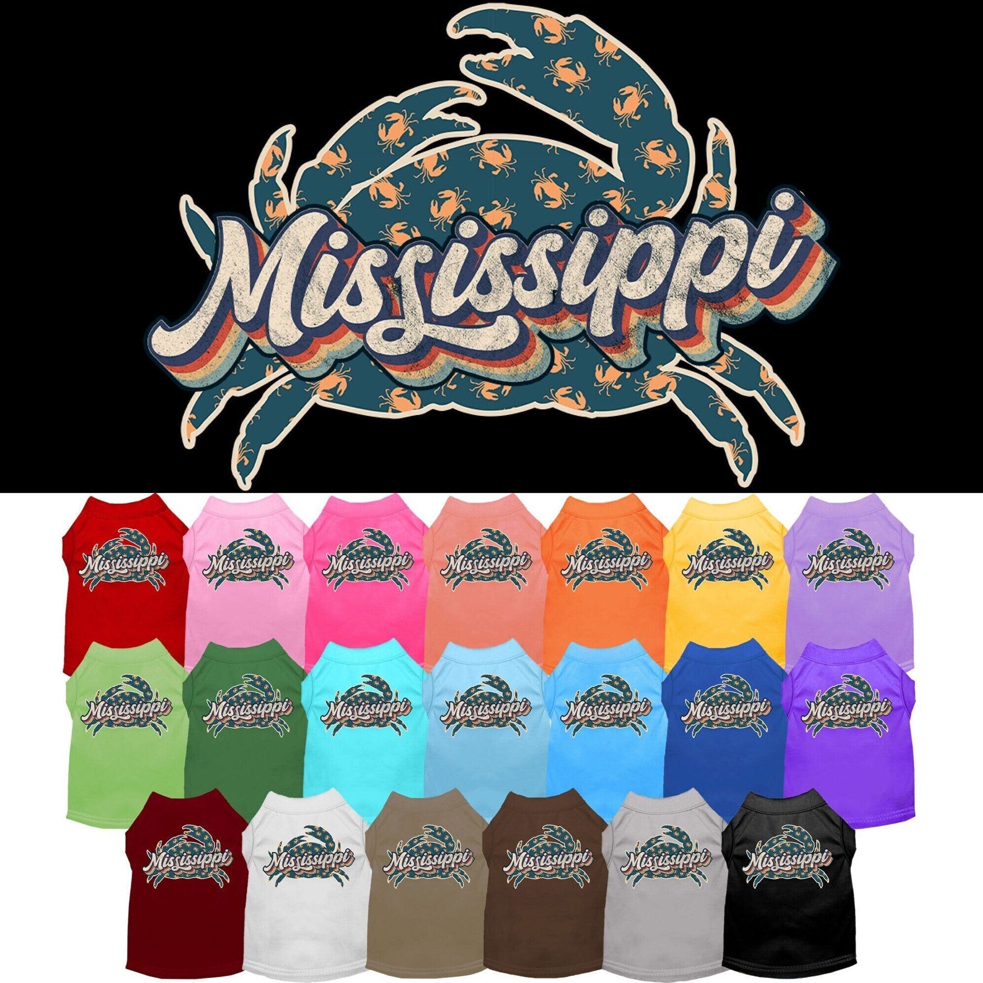 Pet Dog & Cat Screen Printed Shirt for Small to Medium Pets (Sizes XS-XL), "Mississippi Retro Crabs"