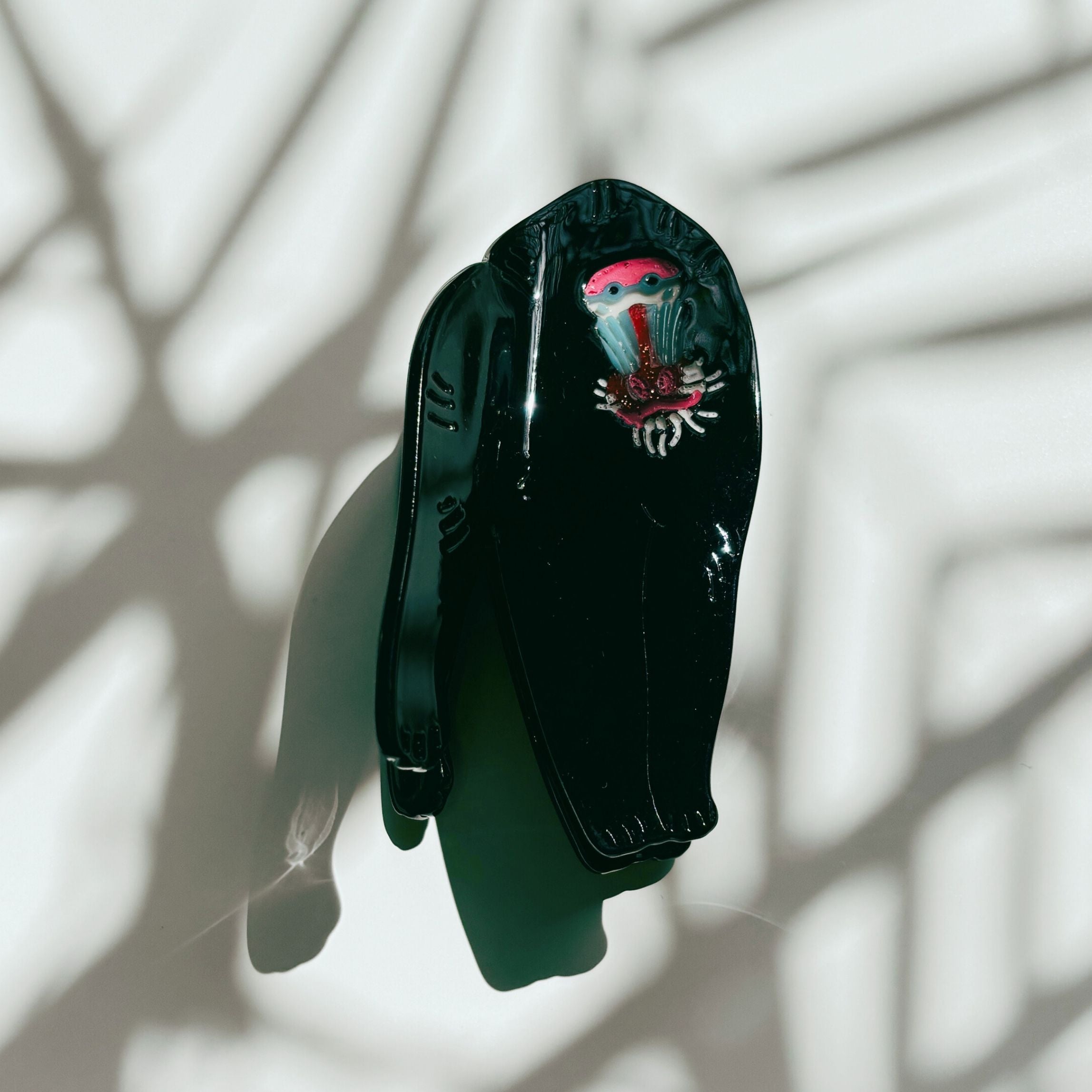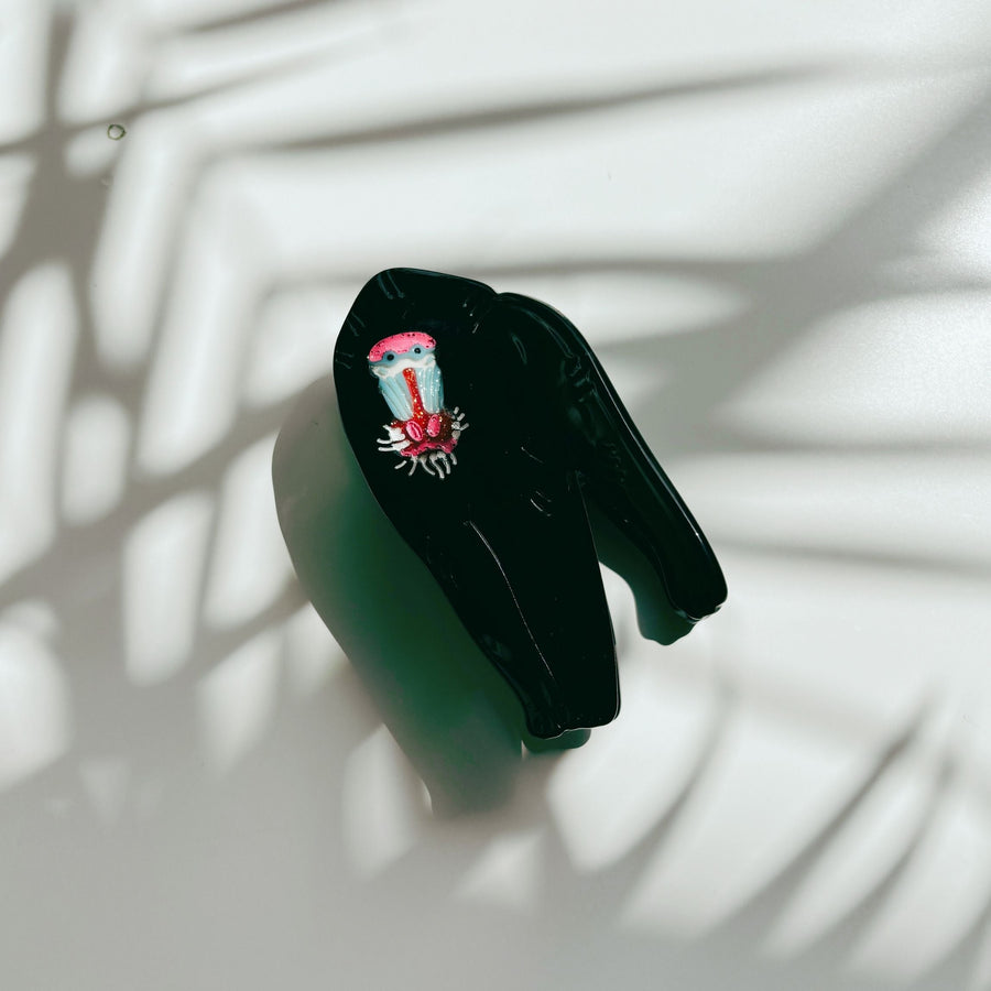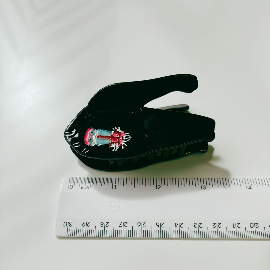Add a bold touch to your hairstyle with this Mandrill Ape Hair Claw in sleek black—because nothing says “secure hold” like a primate known for its powerful grip. Fun fact: mandrills have fangs longer than a lion’s, but don’t worry—this one just wants to keep your hair in place, not scare off your coworkers.