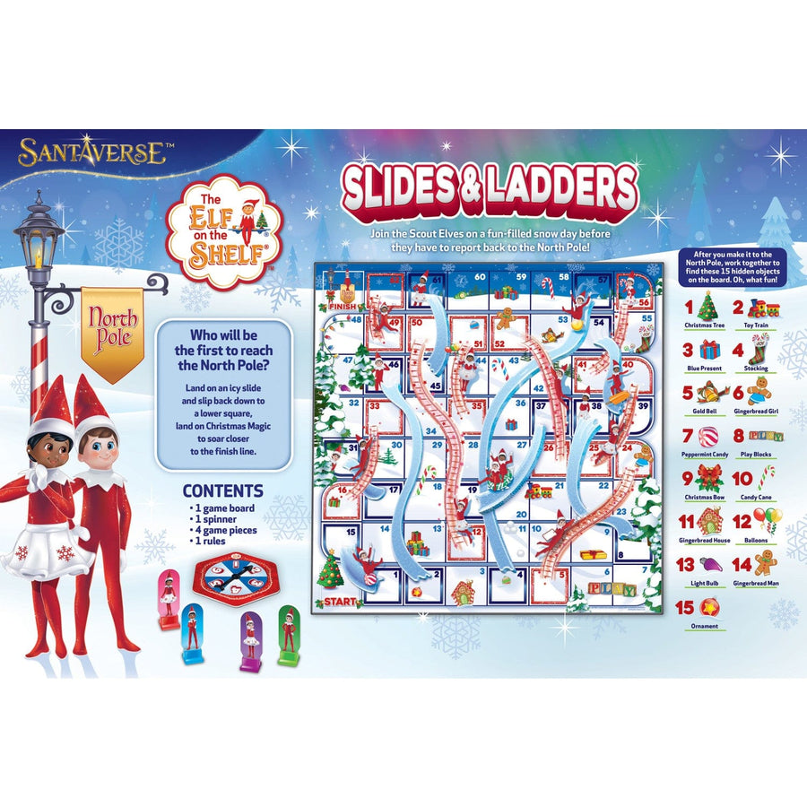 Introducing the SO ELF-DORABLE The Elf on the Shelf Slides & Ladders game by Masterpieces! This classic Christmas board game is perfect for family fun during the holiday season. Enjoy SNOW-TASTIC FUN with your favorite Scout Elves in this Christmas-themed board game. Designed for kids aged 3 and up, this game features a brightly colored game board, 4 SNOW COOL playing pieces, a spinner, and rules. Players will navigate the board using icy slides and Scout Elf Magic ladders, reminiscent of the classic chutes and ladders board game. BELIEVE IN THE MAGIC as you race to the North Pole and discover hidden images on the gameboard. This elf board game is recommended for 2-4 players, making it ideal for Christmas games with kids. Officially licensed, this elf shelf game ensures quality and authenticity. Get ready for a MAGICAL ADVENTURE with The Elf on the Shelf Slides & Ladders Board Game, a must-have for your collection of Christmas board games for kids.