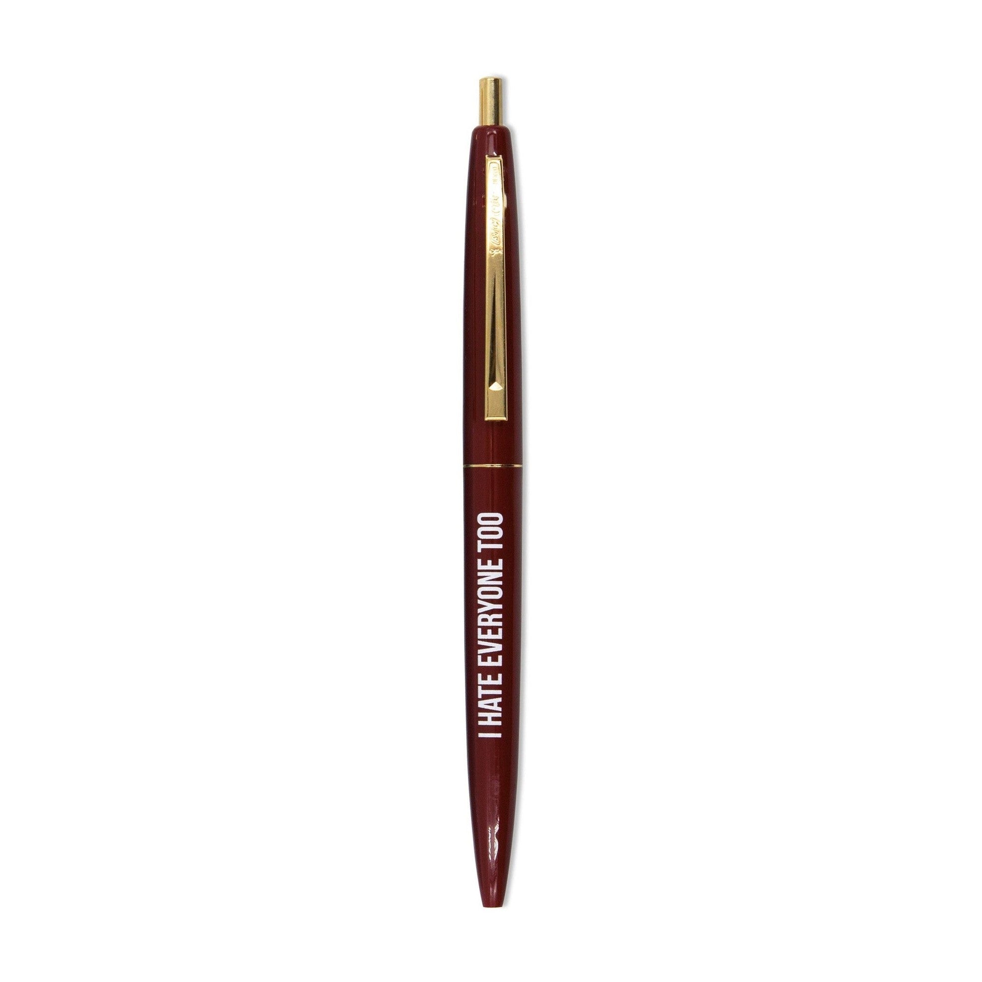 This dark maroon pen reads: "I HATE EVERYONE TOO" in white lettering and writes smoothly in black ink.