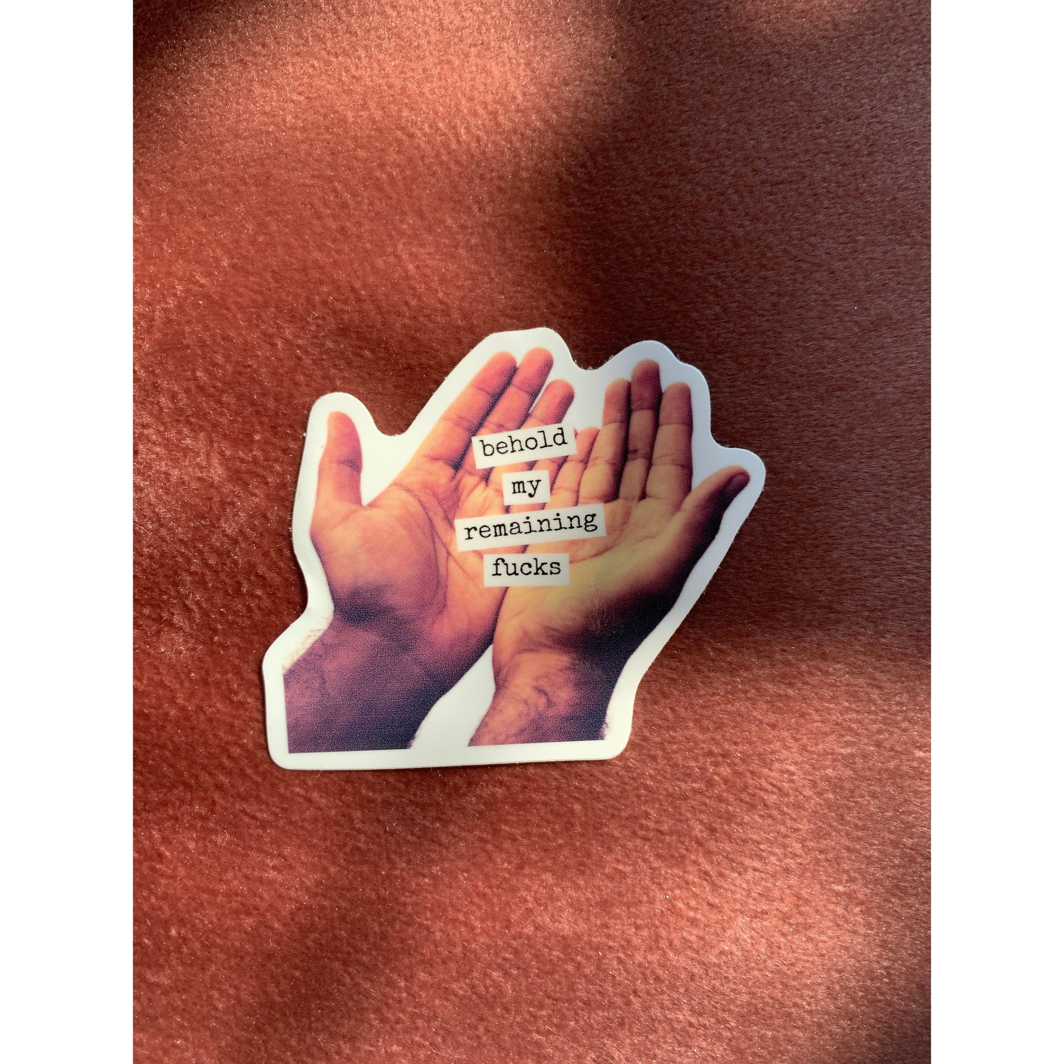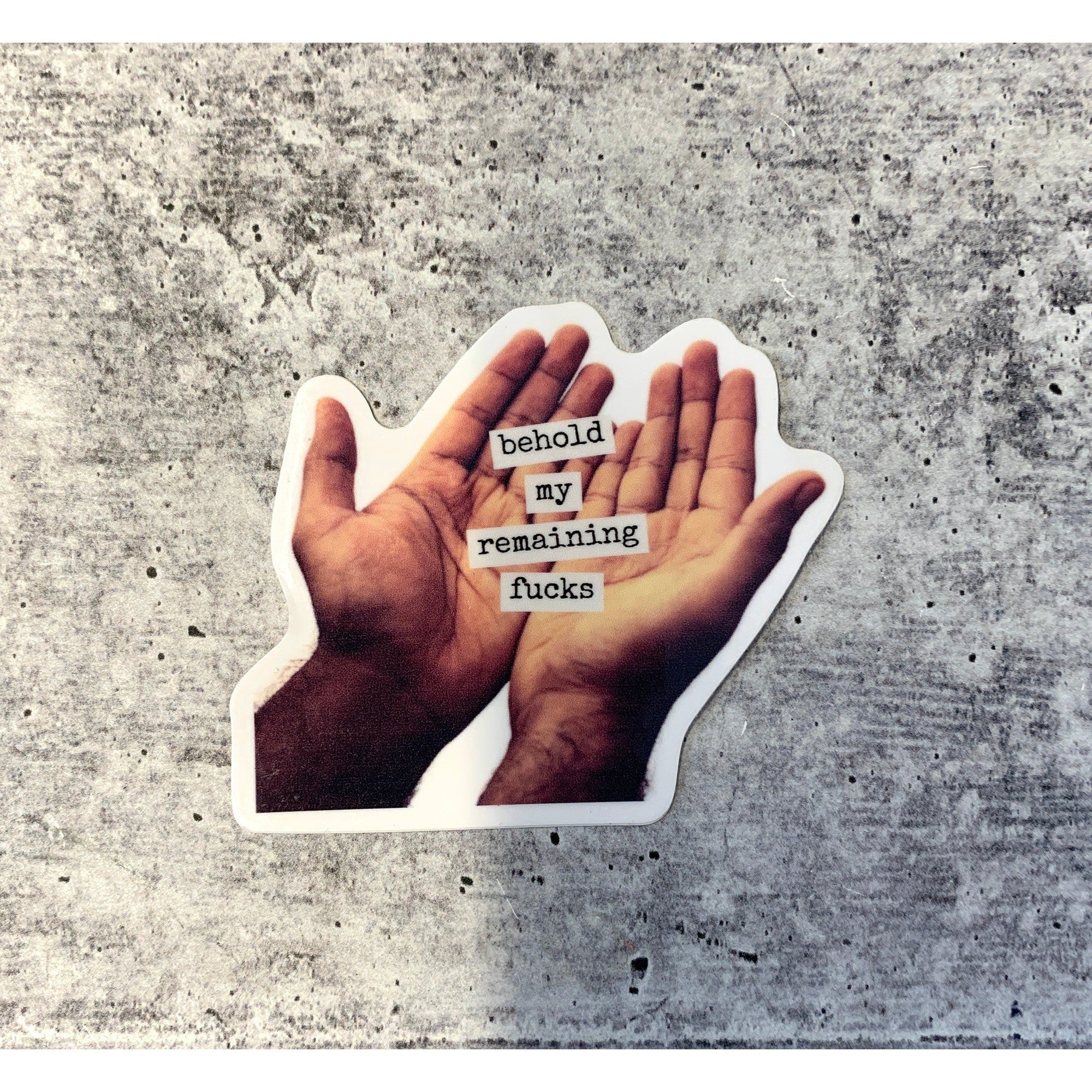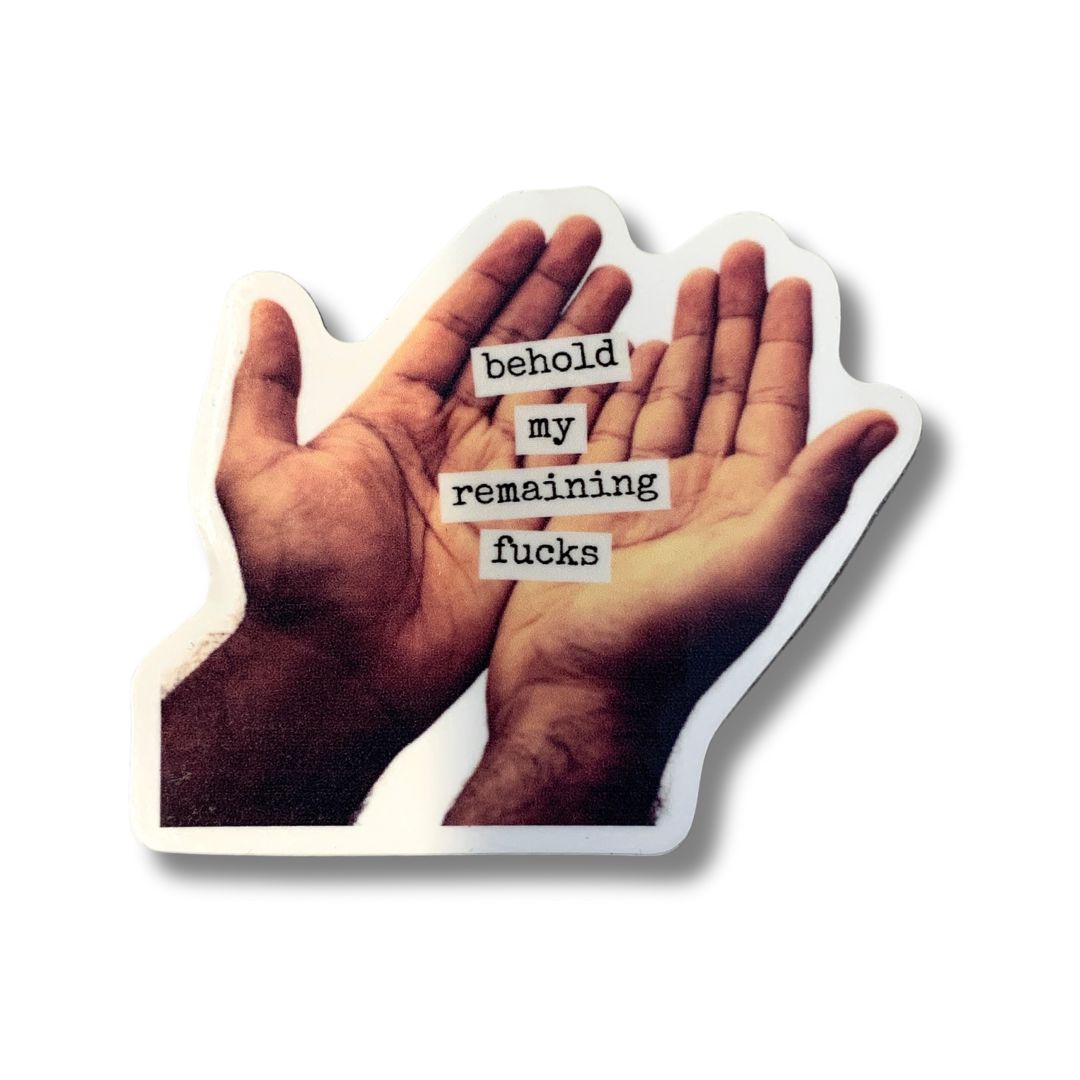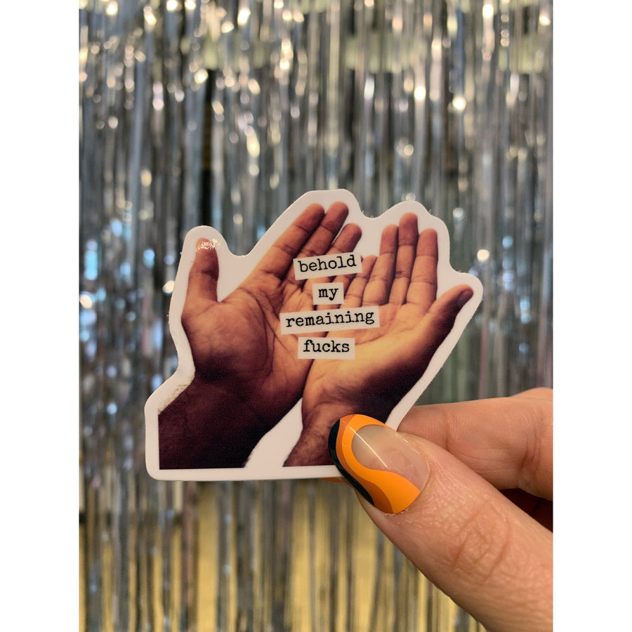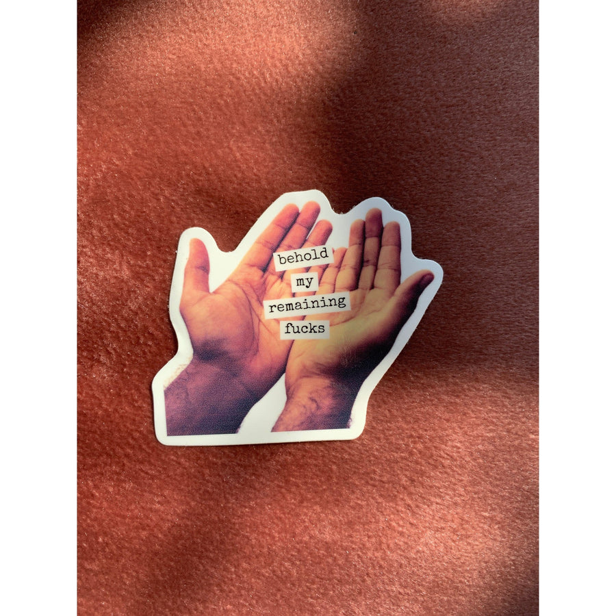 Sticker reads, "Behold My Remaining Fucks"