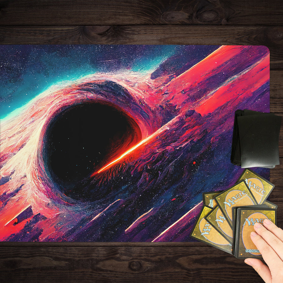 Oversized Playmat measures at 28” x 14” inches and is 1/16 of an inch thick. It’s made with a smooth cloth top and strong rubber backing.