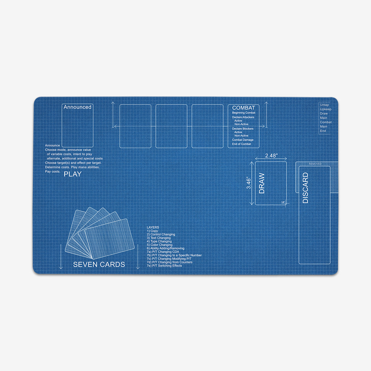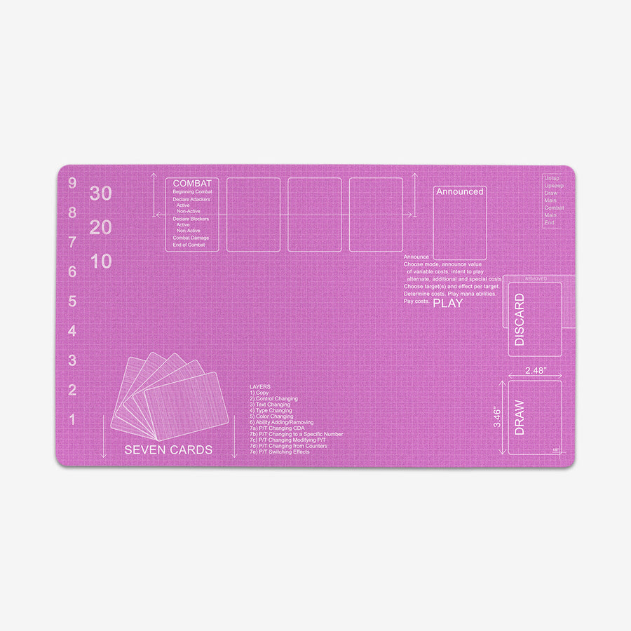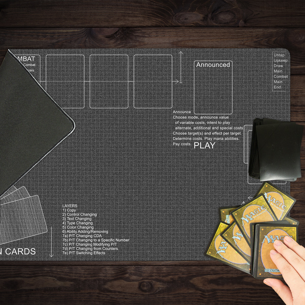 Standard Playmat measures at 24” x 14” inches and is 1/16 of an inch thick. It’s made with a smooth cloth top and strong rubber backing.