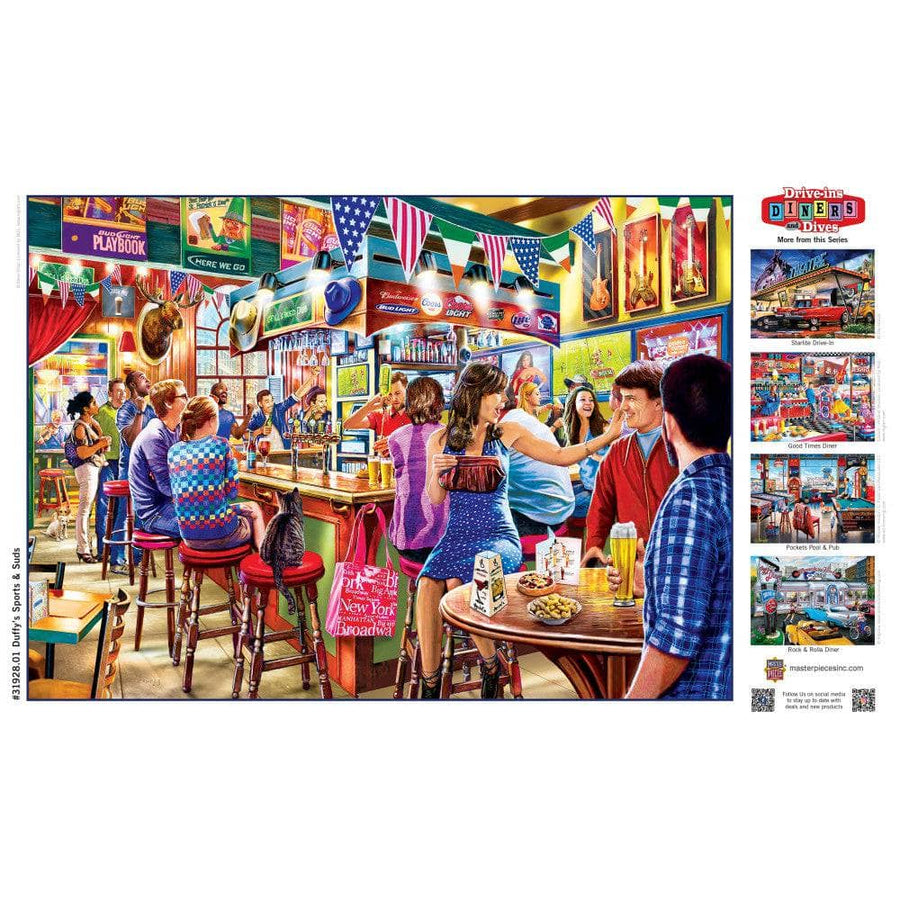 These MasterPieces 21" x 15" 500PC of Drive-Ins, Diners and Dives are fun nostalgia puzzles. Take yourself back to a simpler time where classic cars rules the road and be-bop on the airwaves. Classic Diners and Drive Ins still rules Friday night fun and even the occasional Dive. To reduce their impact on our environment, the chipboard used in these puzzles is made of recycled material.