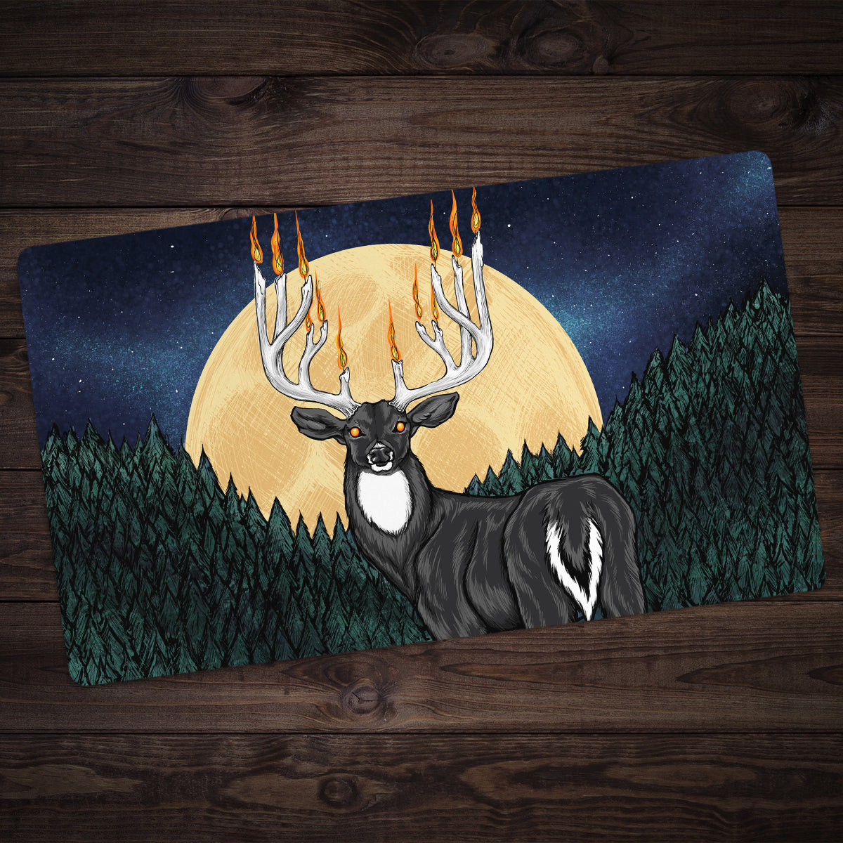 Oversized Playmat measures at 28” x 14” inches and is 1/16 of an inch thick. It’s made with a smooth cloth top and strong rubber backing.