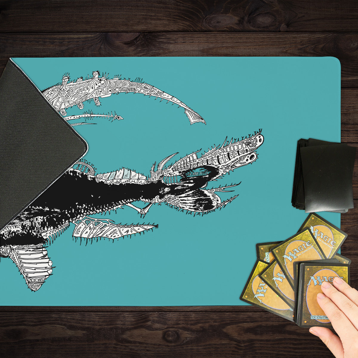Oversized Playmat measures at 28” x 14” inches and is 1/16 of an inch thick. It’s made with a smooth cloth top and strong rubber backing.