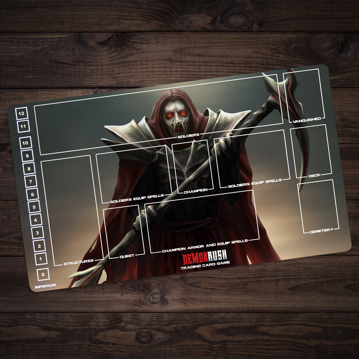 Standard Playmat measures at 24” x 14” inches and is 1/16 of an inch thick. It’s made with a smooth cloth top and strong rubber backing.