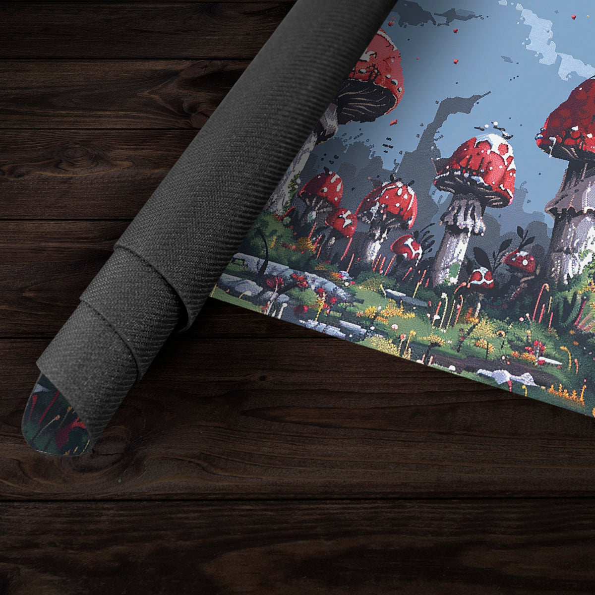 Standard Playmat measures at 24” x 14” inches and is 1/16 of an inch thick. It’s made with a smooth cloth top and strong rubber backing.