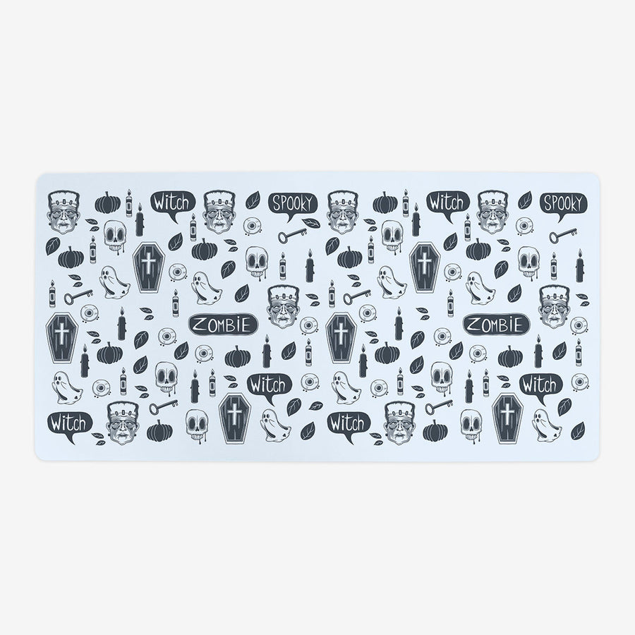 Oversized Playmat measures at 28” x 14” inches and is 1/16 of an inch thick. It’s made with a smooth cloth top and strong rubber backing.