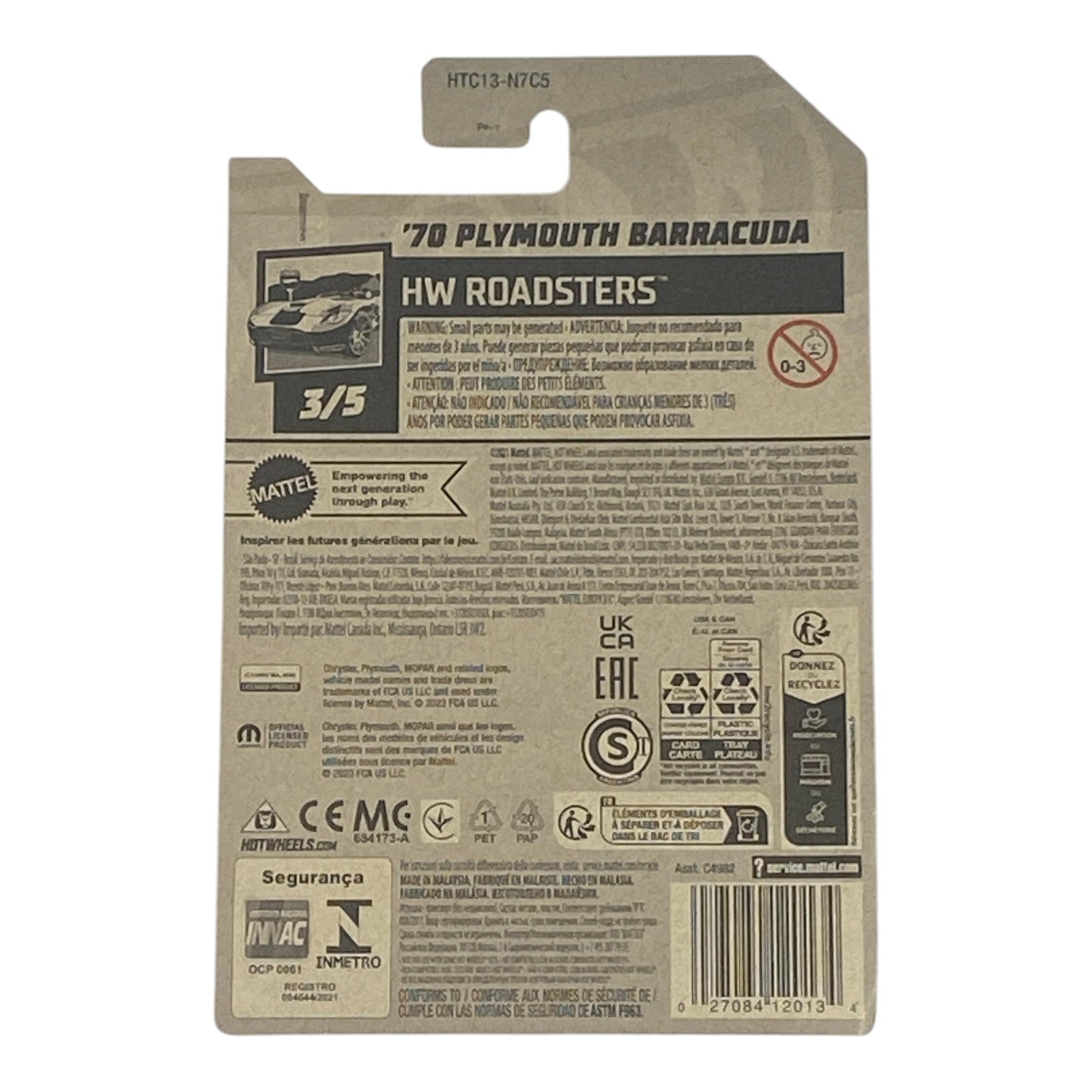 - Roadsters Series Highlight: Key #3/5 release in the Hot Wheels Roadsters collection, featuring the iconic '70 Plymouth Barracuda as a sleek convertible with vibrant metalflake blue finish.