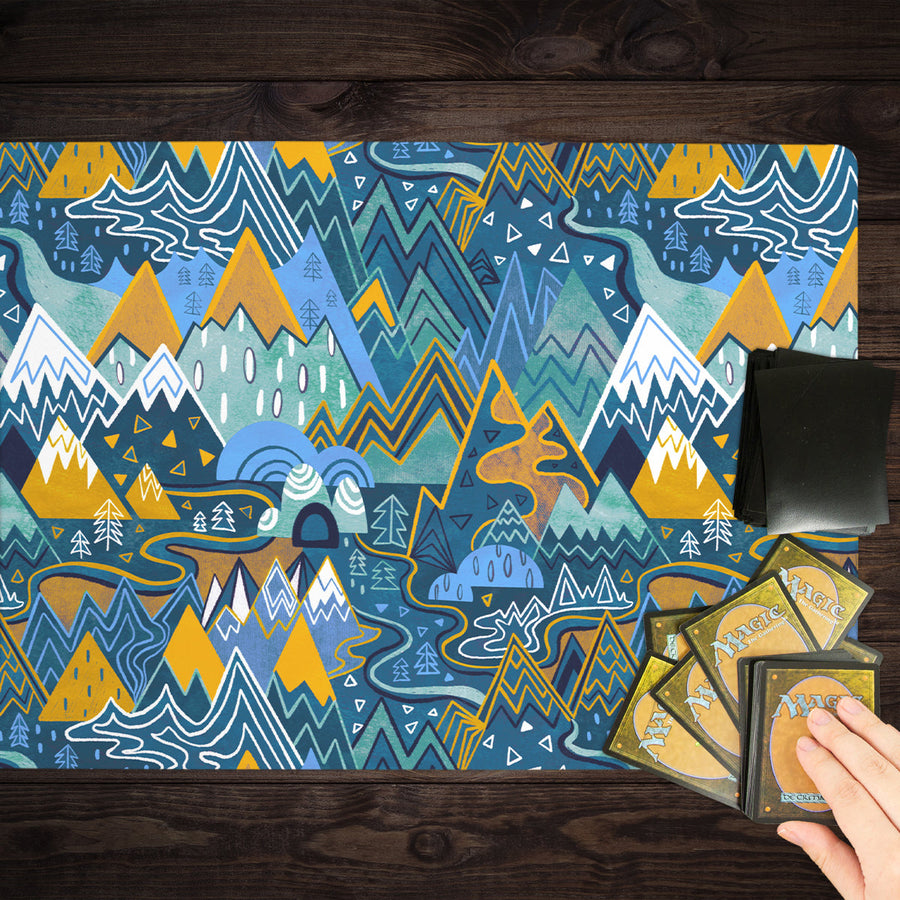 Oversized Playmat measures at 28” x 14” inches and is 1/16 of an inch thick. It’s made with a smooth cloth top and strong rubber backing.