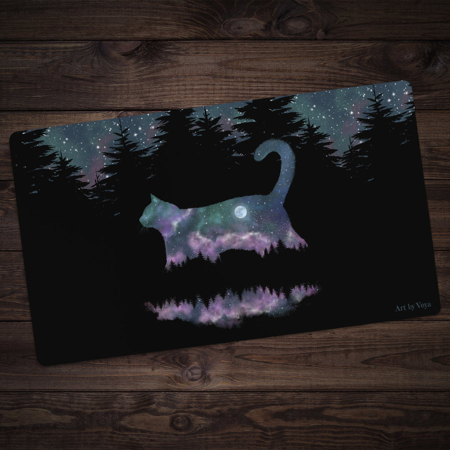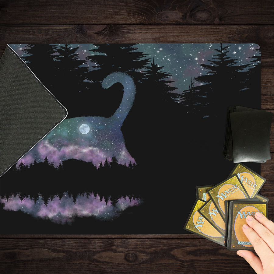 Oversized Playmat measures at 28” x 14” inches and is 1/16 of an inch thick. It’s made with a smooth cloth top and strong rubber backing.