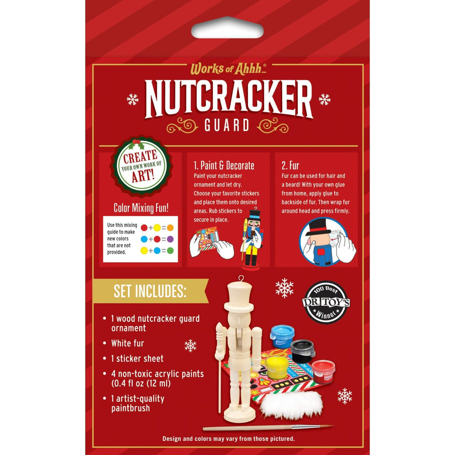 Discover the joy of creativity with the Works of Ahhh... Nutcracker Guard Ornament - Holiday Mini Paint Kit. This delightful nutcracker craft kit is perfect for kids who love art and the holiday season. Made from real wood, this paintable nutcracker ornament set includes everything needed to create a stunning piece of art. The kit features a 5" tall wooden nutcracker ornament, adorned with white fur, and comes with a sticker sheet, four non-toxic acrylic paint tubs, and an artist-quality paintbrush. Ideal for DIY enthusiasts, this mini nutcracker ornament kit allows children to paint their own nutcracker, fostering creativity and fine motor skills. The nutcracker measures approximately 5" tall, 1.6" wide, and 1.3" deep, making it a charming addition to any Christmas decor. Whether you're looking for small nutcracker ornaments to decorate your tree or a unique gift for an art-loving child, this unfinished nutcracker kit is the perfect choice. Embrace the holiday spirit with this versatile and engaging nutcracker ornament, designed to inspire and delight.