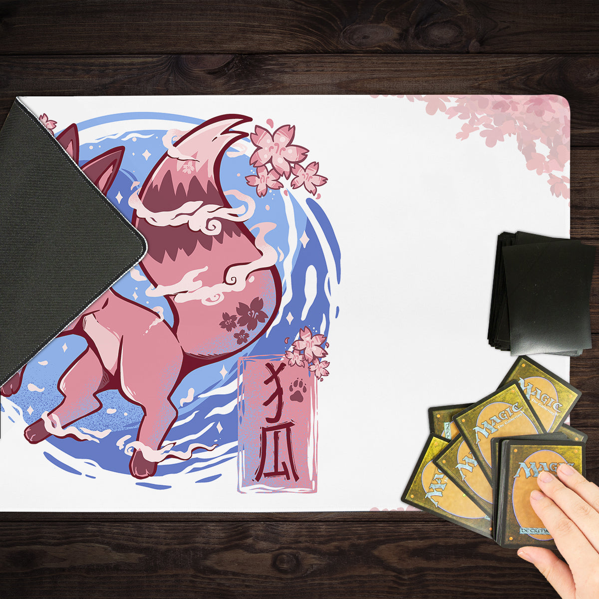 Oversized Playmat measures at 28” x 14” inches and is 1/16 of an inch thick. It’s made with a smooth cloth top and strong rubber backing.