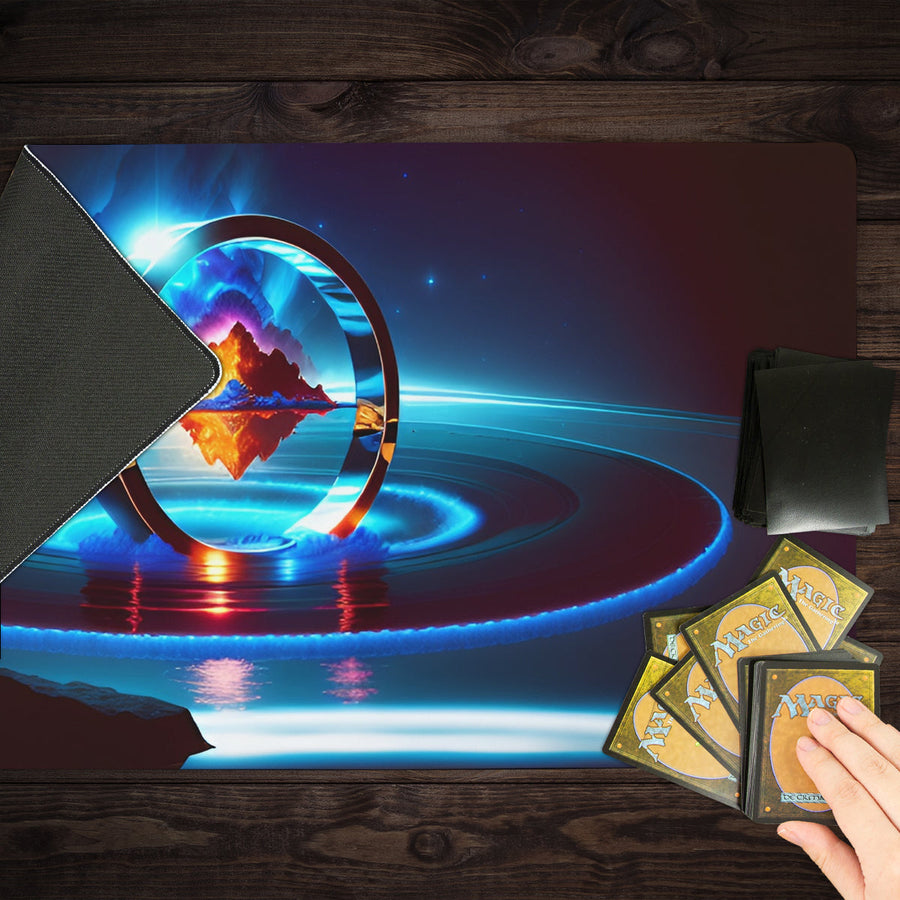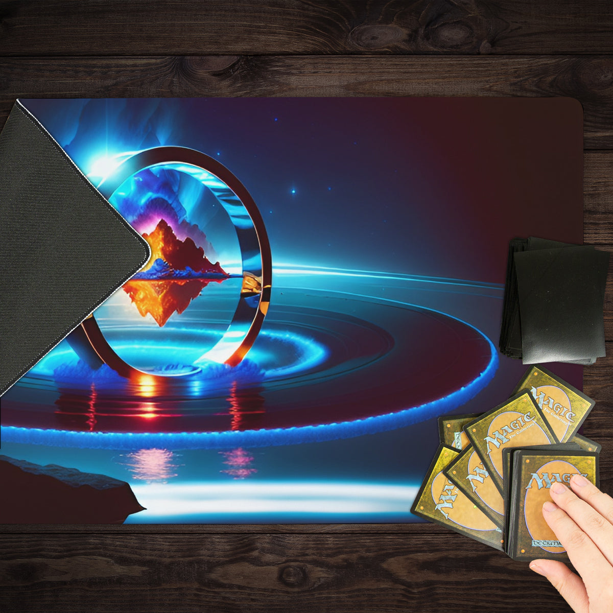 Oversized Playmat measures at 28” x 14” inches and is 1/16 of an inch thick. It’s made with a smooth cloth top and strong rubber backing.