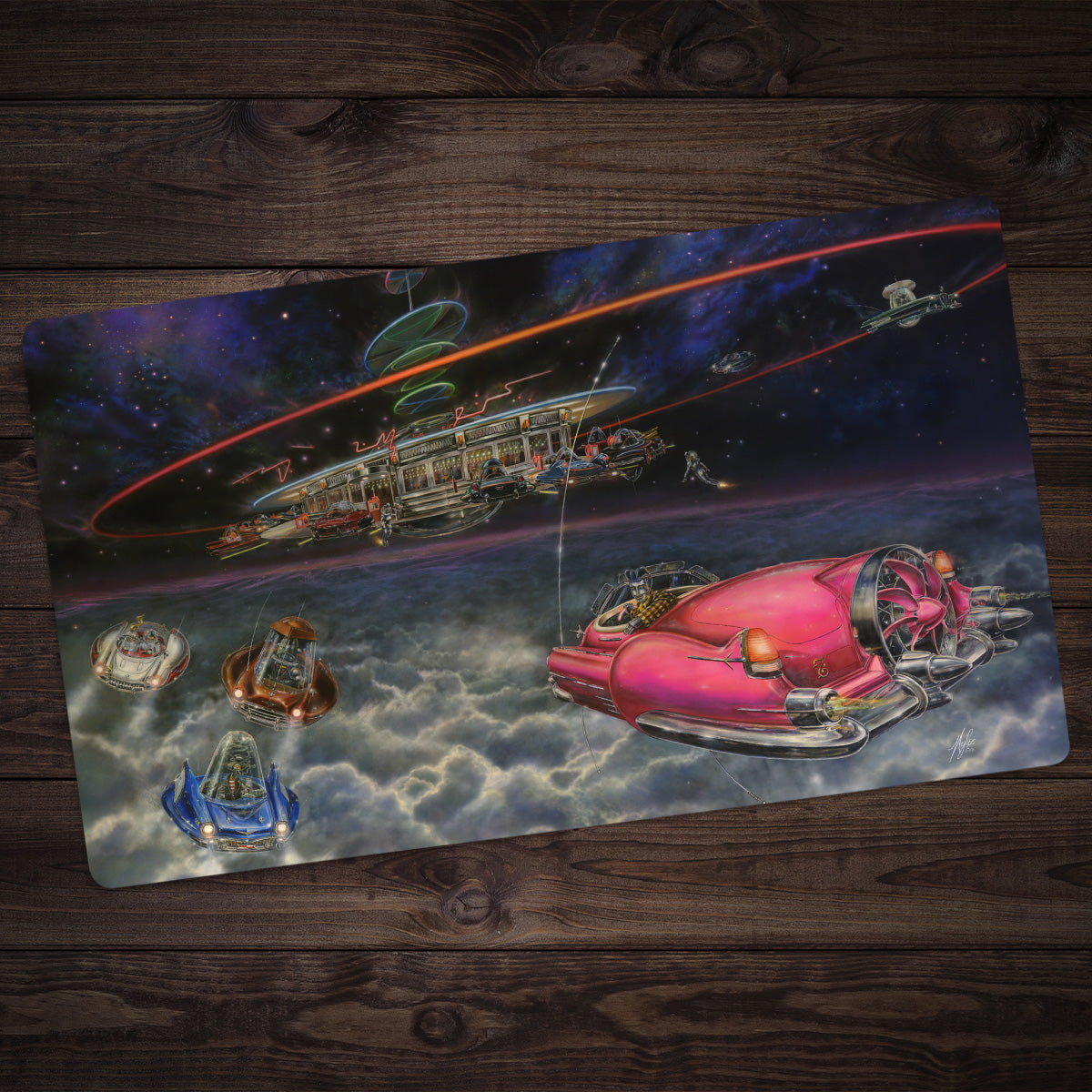 Oversized Playmat measures at 28” x 14” inches and is 1/16 of an inch thick. It’s made with a smooth cloth top and strong rubber backing.